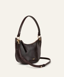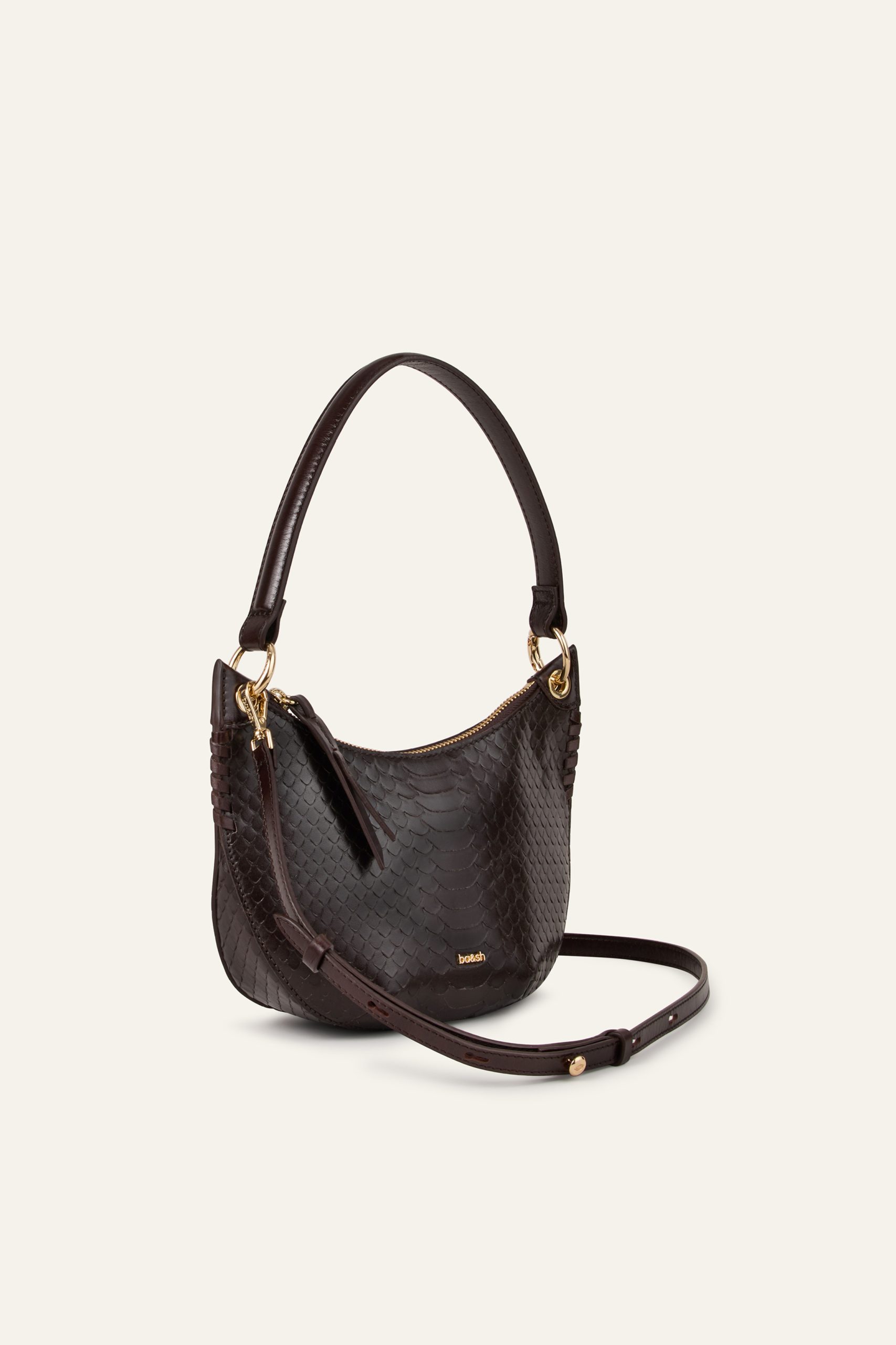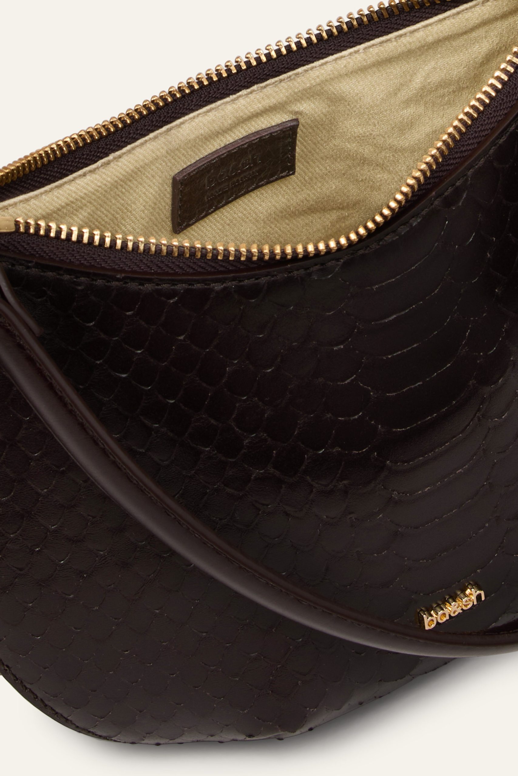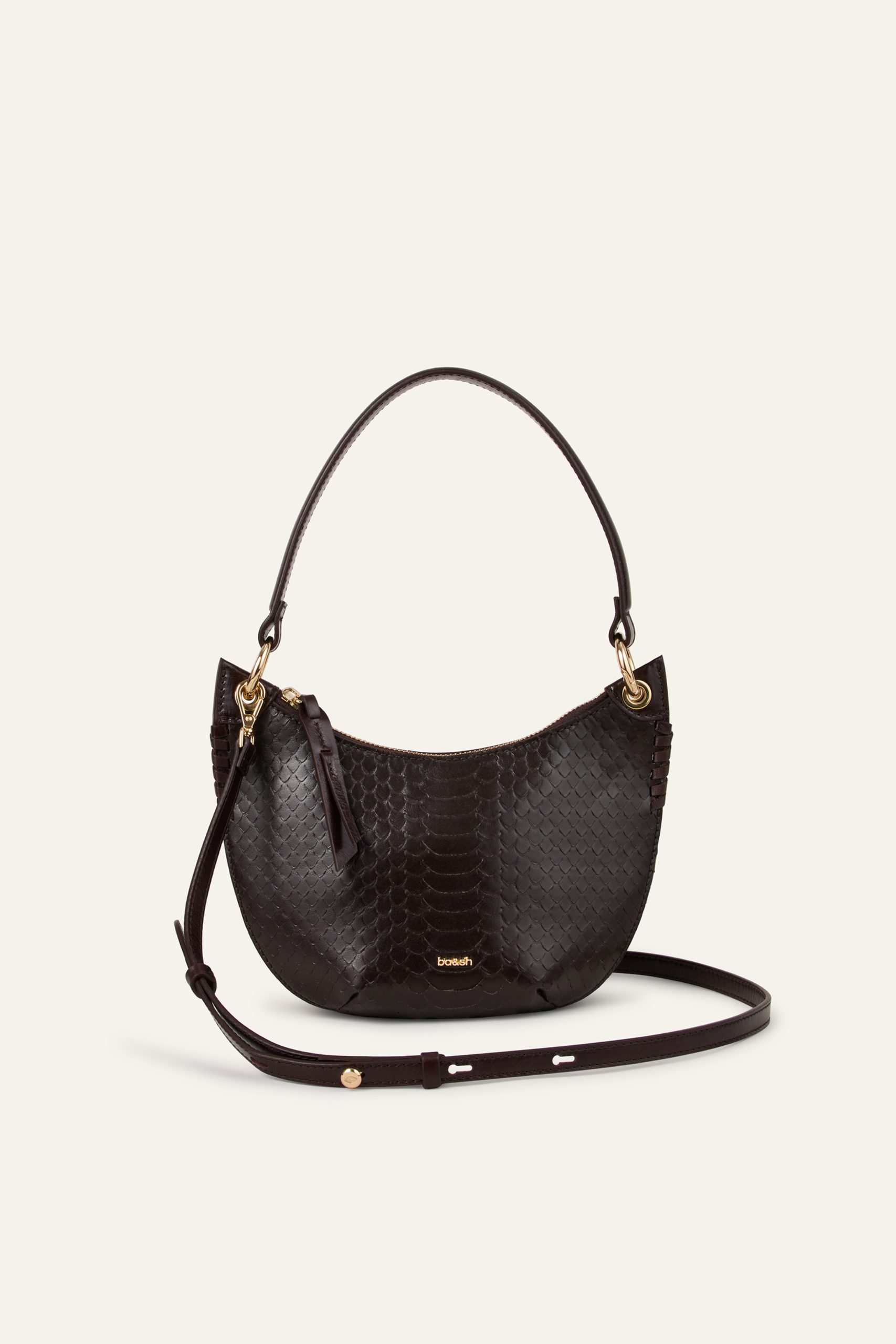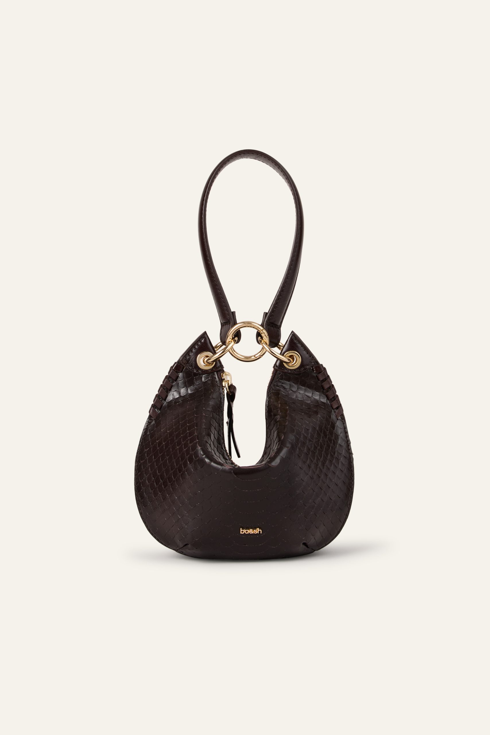 – Round shape- Convertible into a ball bag- Asymmetrical rings and metal carabiners (brand signature)- Done up with a zipper- Removable strap- Curved and covered shoulder strap- Stitching details- Metal brand logo on the front- Material: Italian coated goat leather- Carried by hand, on the shoulder or across the body- Size: 18 cm x 23 cm x 9 cm