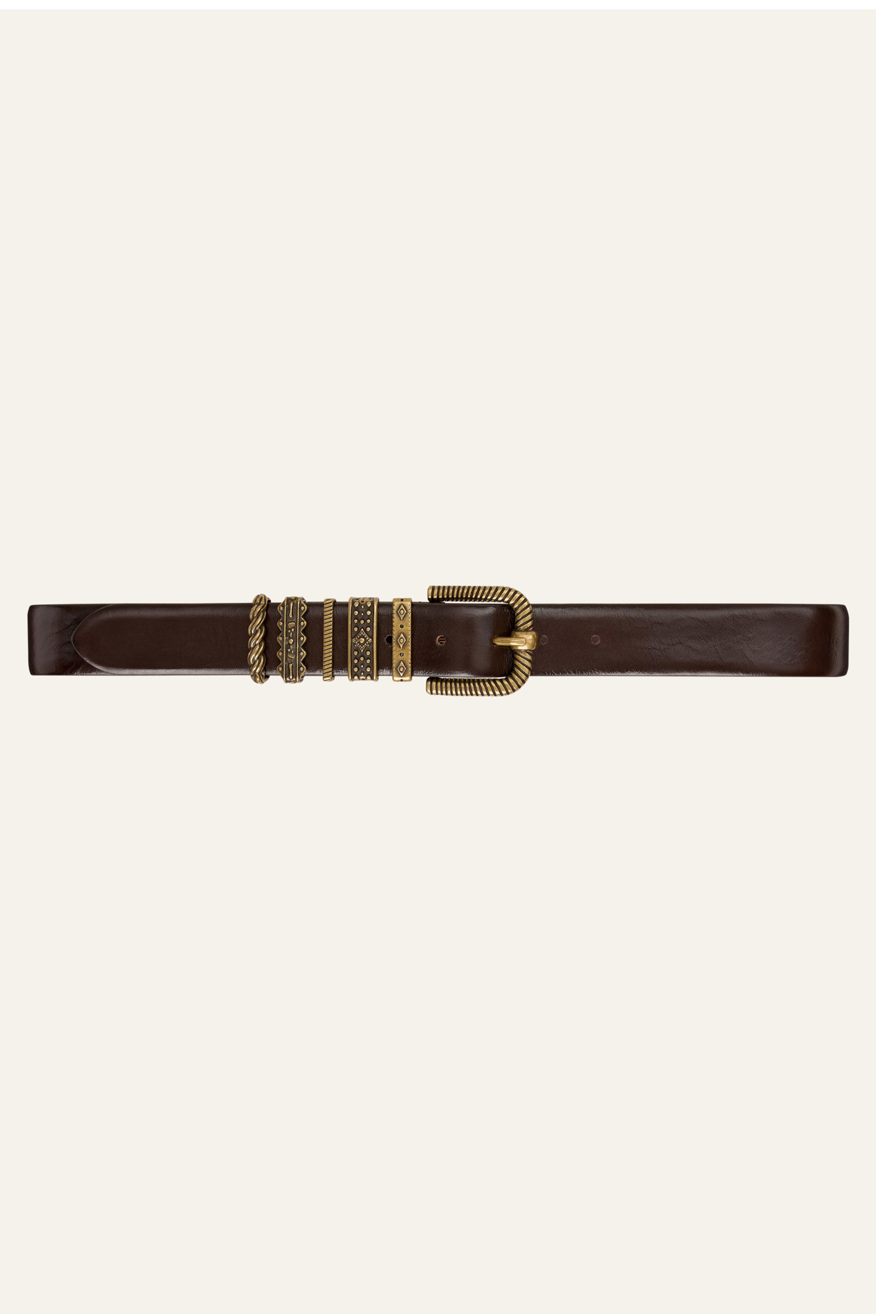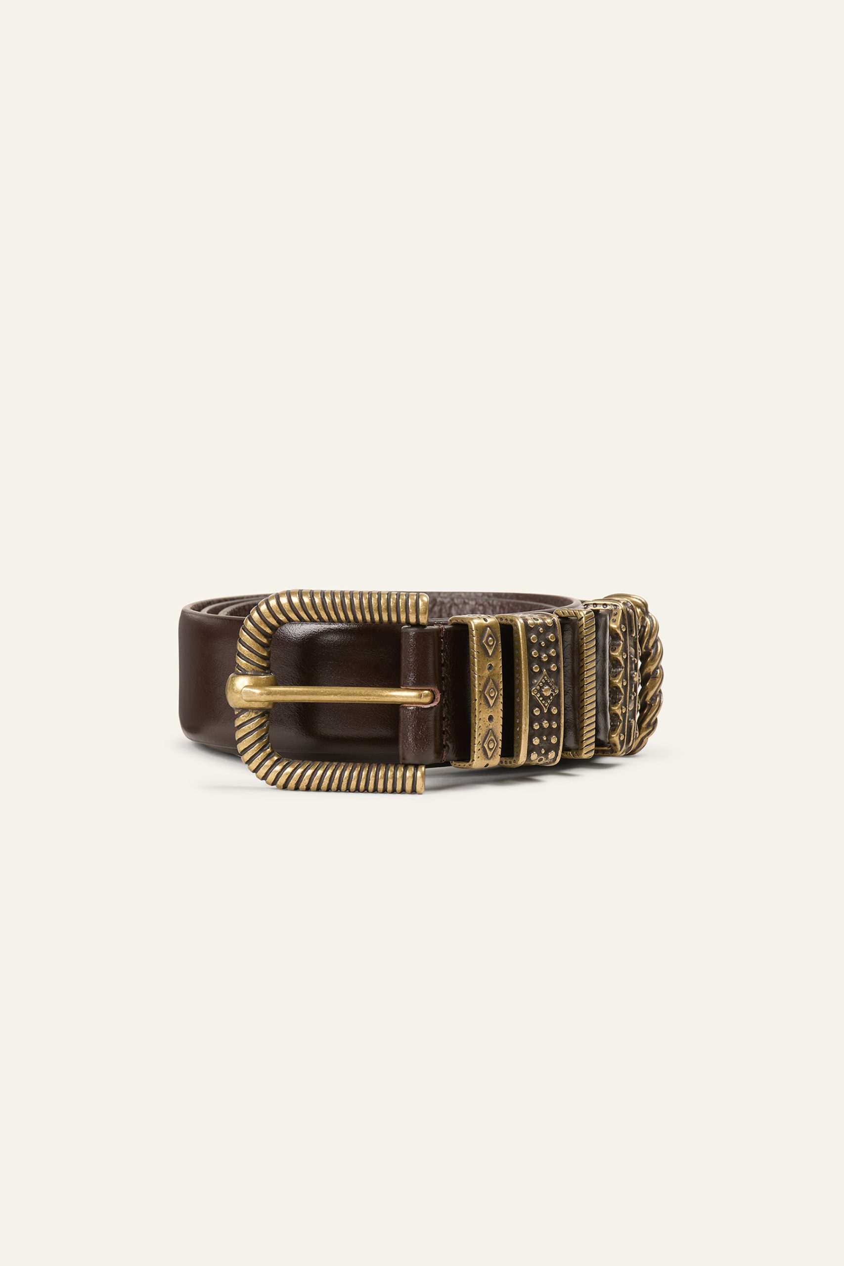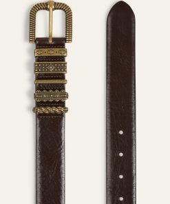 – Engraved loops in aged silver- Adjustable length- Metal buckle- Cowhide certified by Leather Working Group- Dimensions: length 85/90 cm x width 3.5 cm- Made in Italy