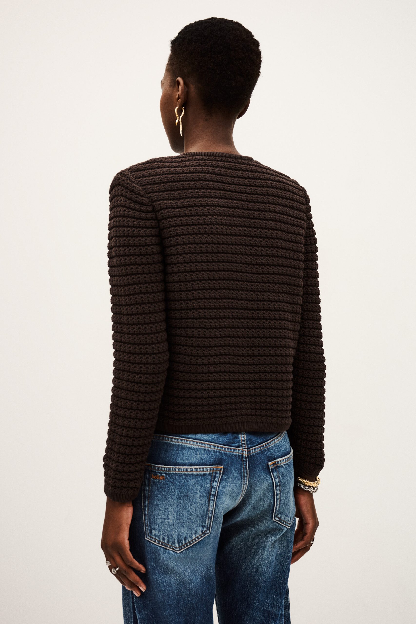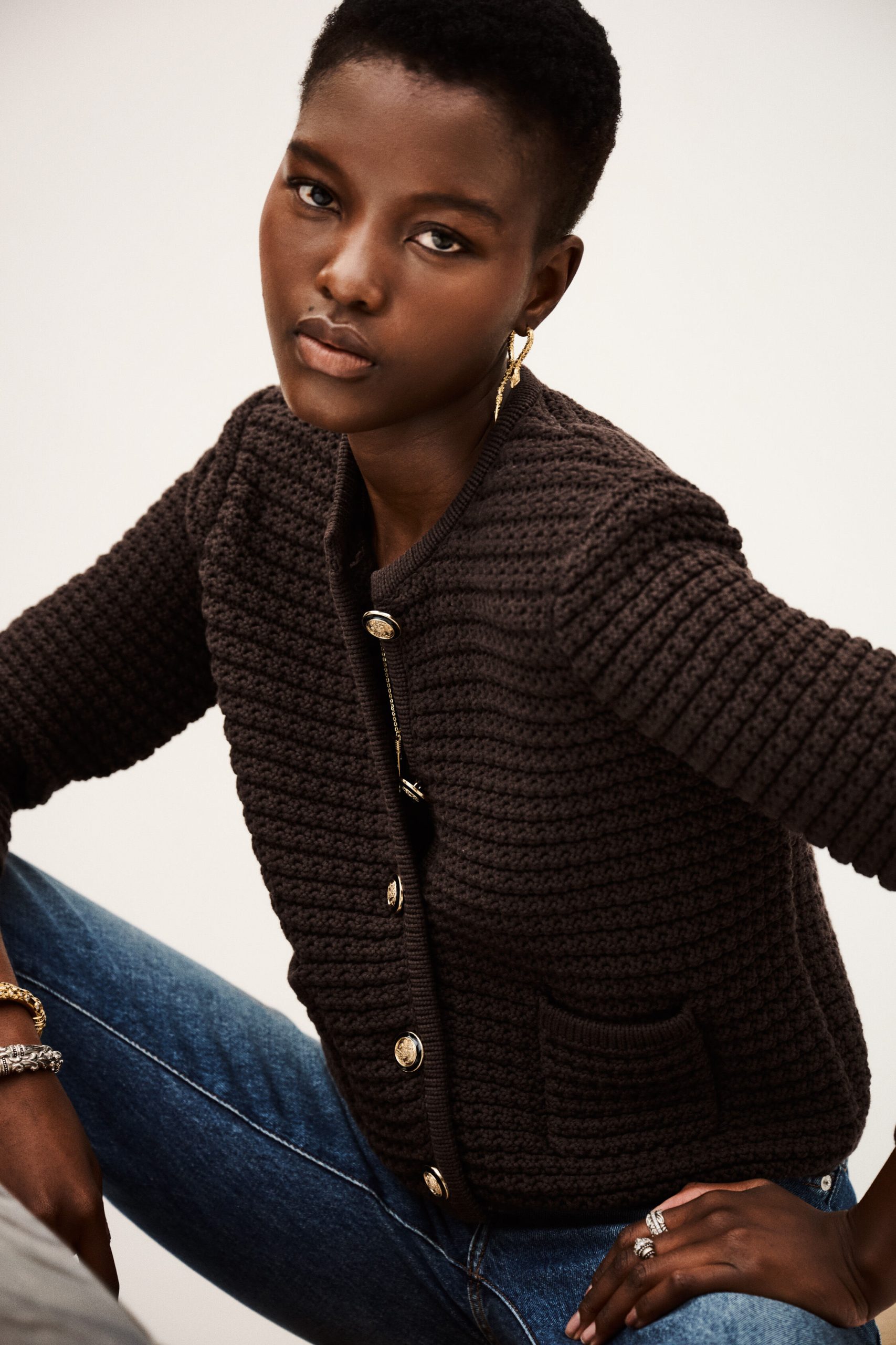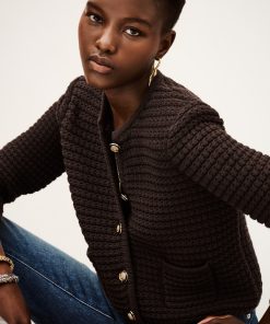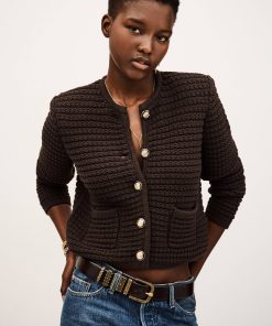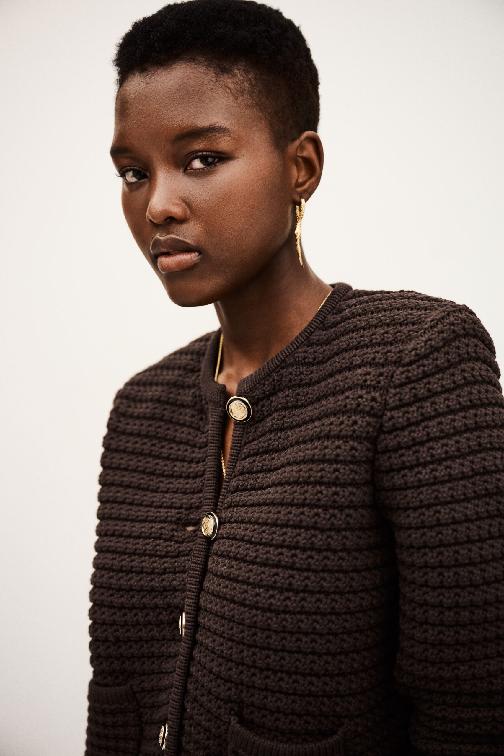 – Straight cut- Buttoned- 7/8 sleeves- Round neckline- Golden metal buttons- Patch pockets- Small shoulder pads This item is made with organic cotton.