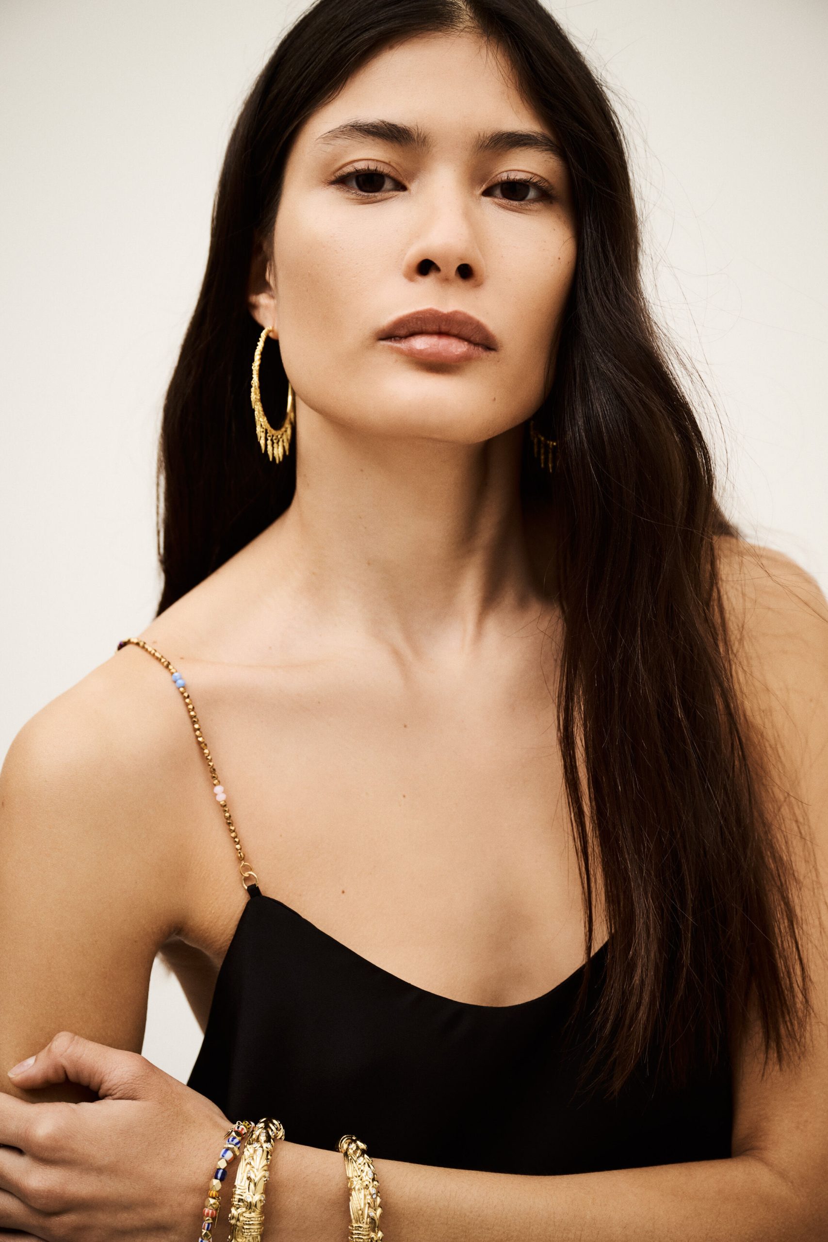 This short CLEM dress is inspired by our CARLINE dress. A mini slip style dress? What could be better! This flowing dress literally caresses your skin. Its straps are beaded for the utmost in chic. We love the super glamorous low-cut neckline in back, sure to make you stand out at parties. Pair this dress with your prettiest heels and a clutch to be queen of the night. – Beaded straps- Short dress- Low-cut rear neckline