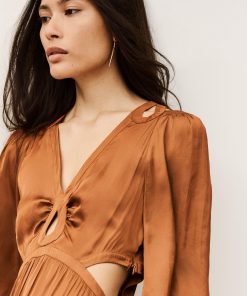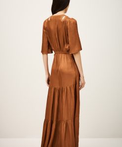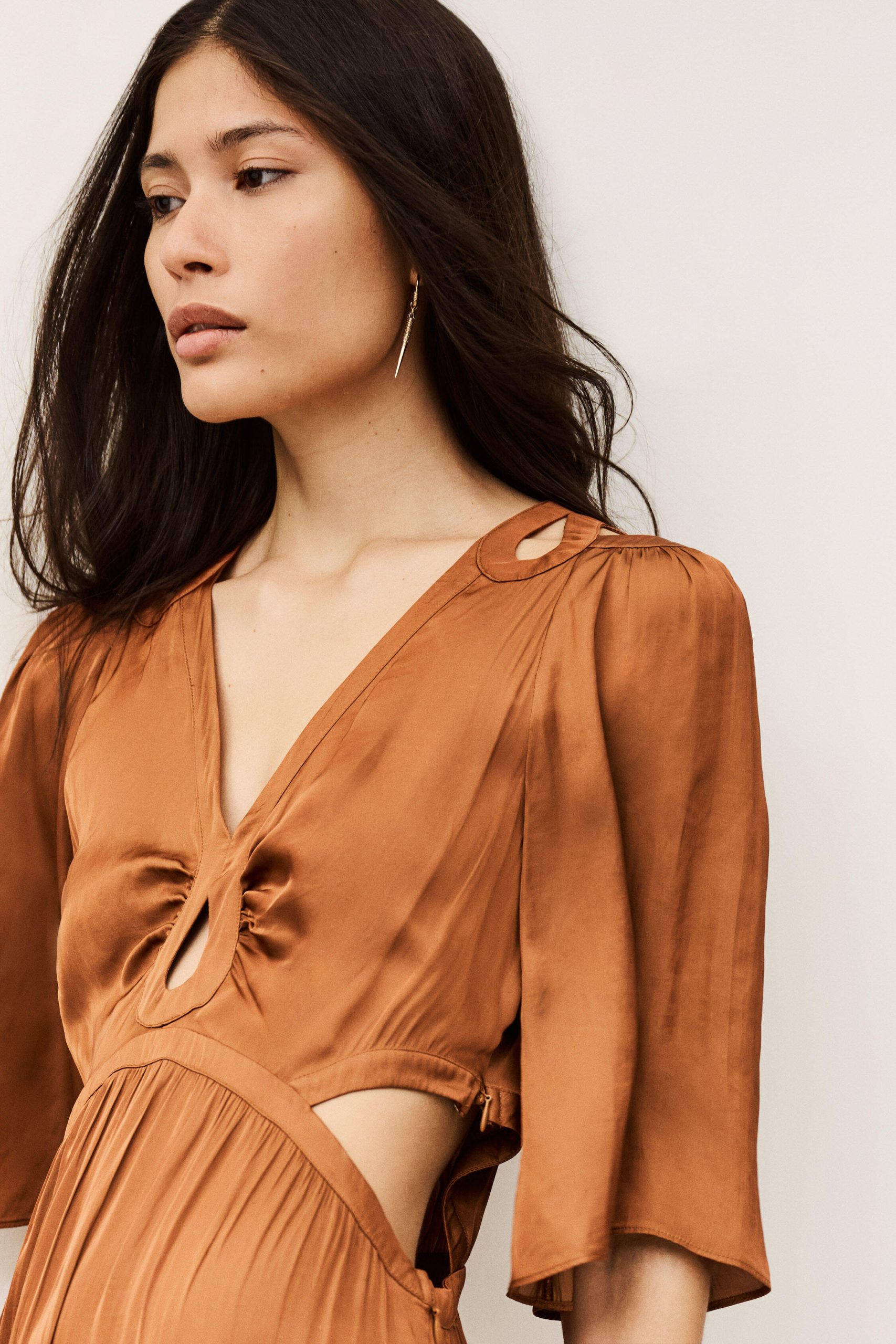 – Maxi length- Flared cut- Short butterfly sleeves- Fitted waist- V-neckline- Gathered detailsThis model contains recycled synthetic fibers.