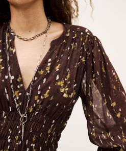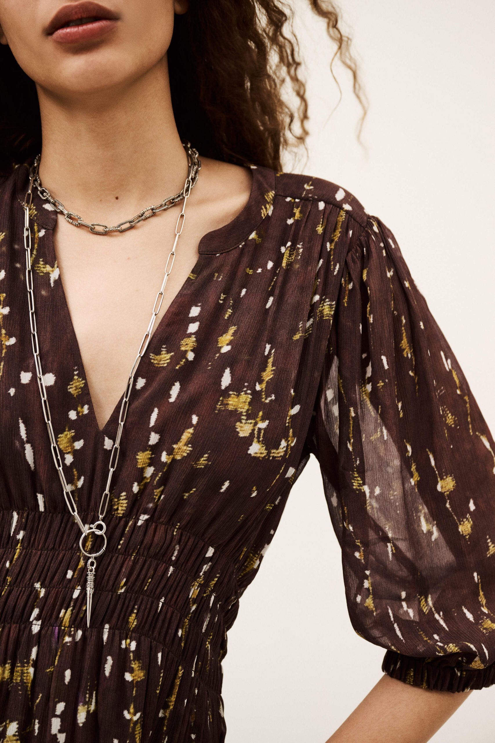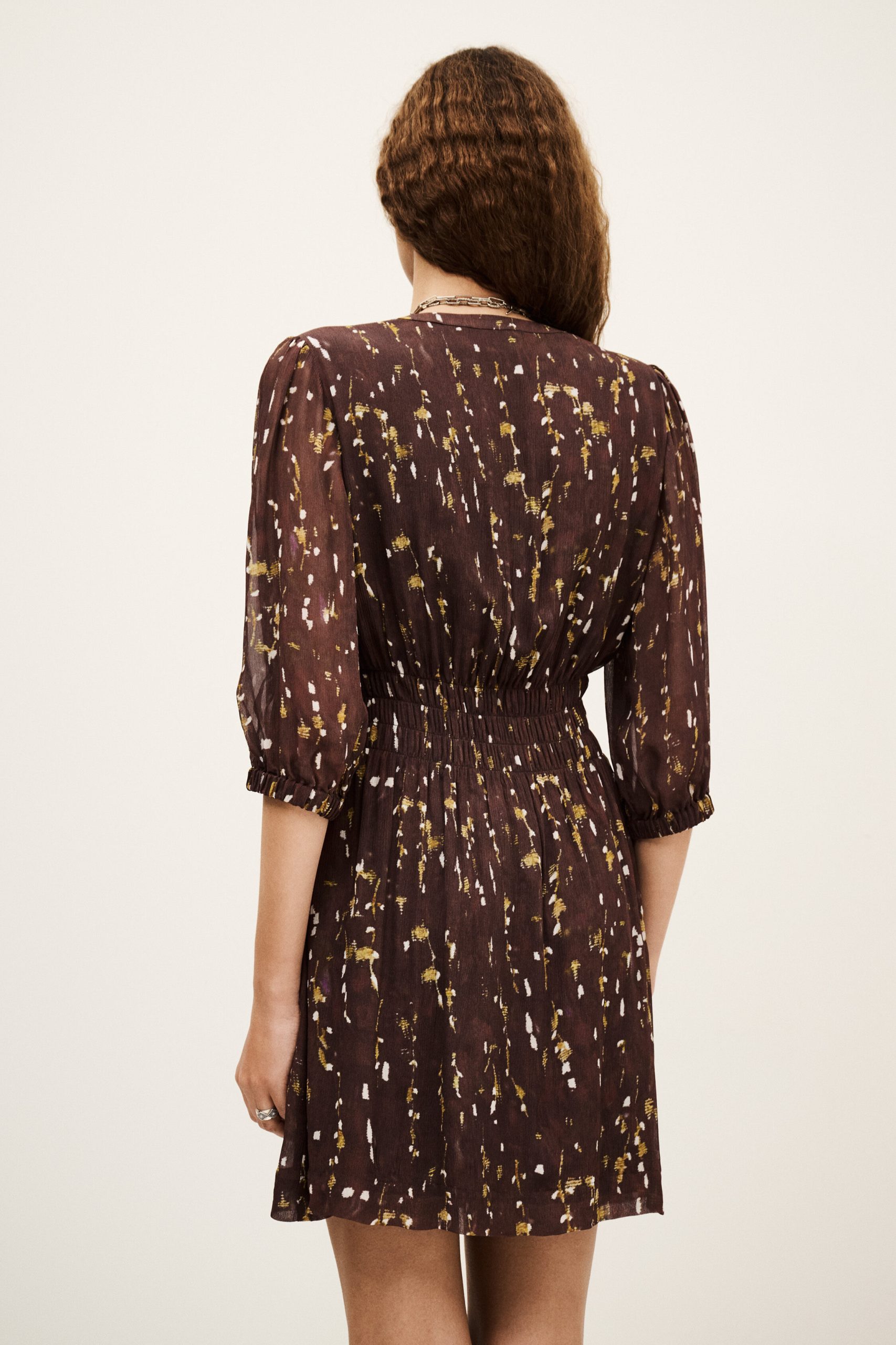 – V-neckline- Smocked waist- Elasticated sleeve ends- Flared base- Lining- Graphic printThe viscose in this model is made from wood pulp from sustainably managed forests.