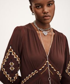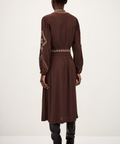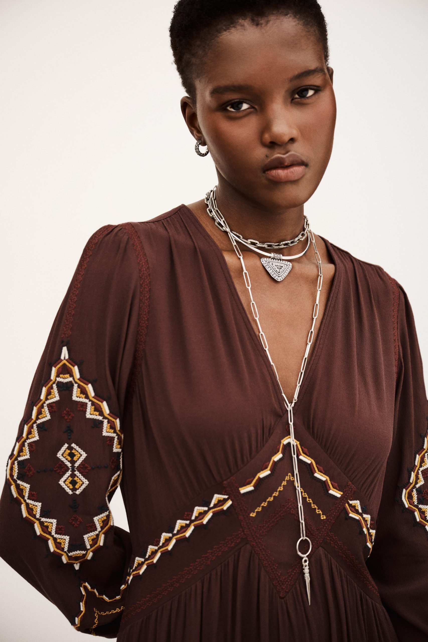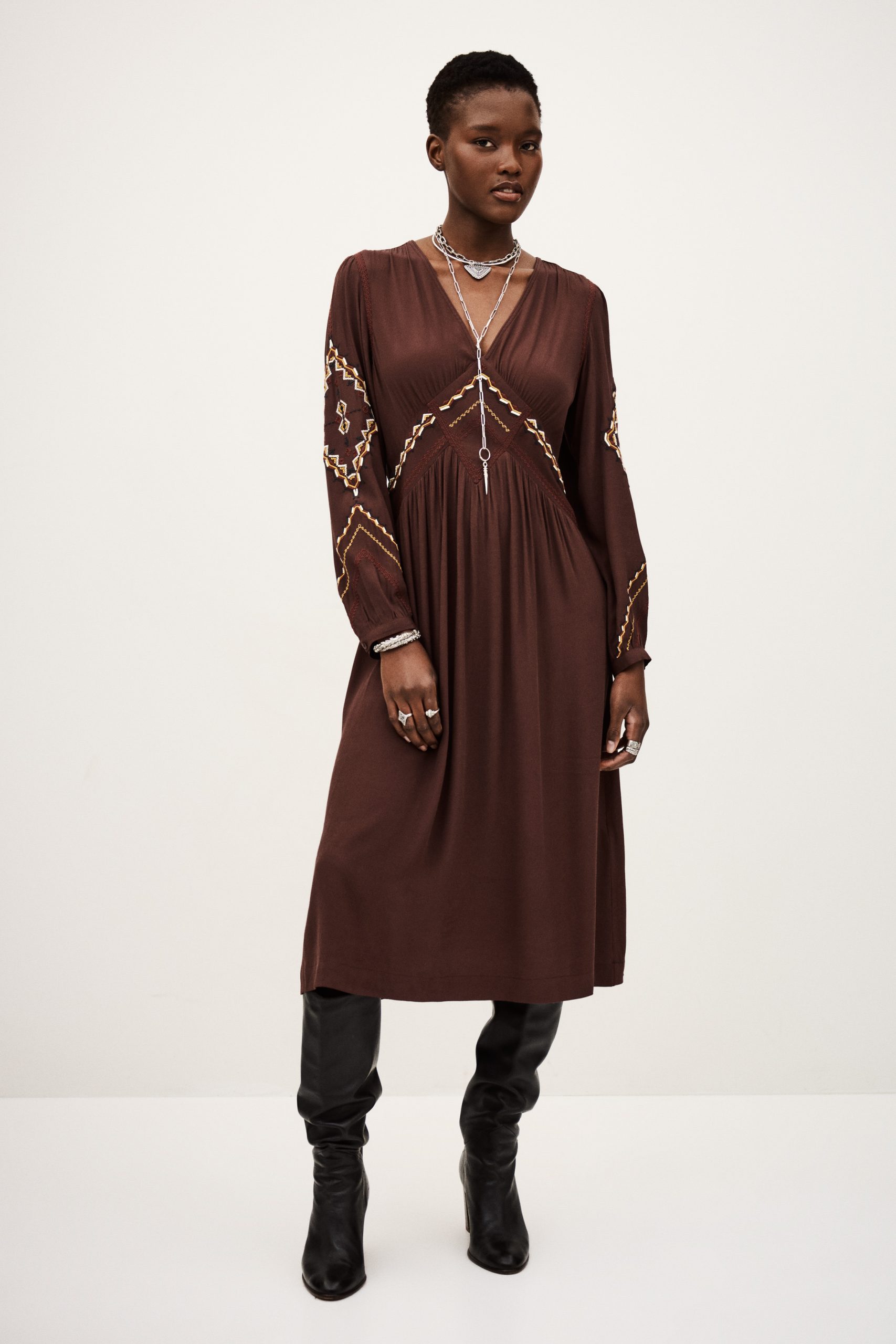 – Flowy midi cut- V-neck- Long puff sleeves- Fitted waist with embroidered braid detail- Flared skirt- Diamond insert with embroidered design just under the bustThis model contains LENZING™ ECOVERO™ viscose, a fiber made from wood pulp from sustainably managed forests. LENZING™ and ECOVERO™ are trademarks of Lenzing AG.The viscose in this model is made from wood pulp from sustainably managed forests.