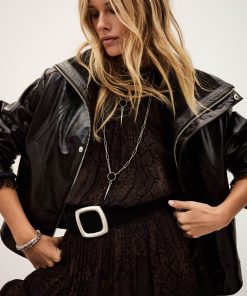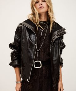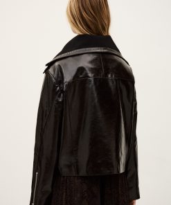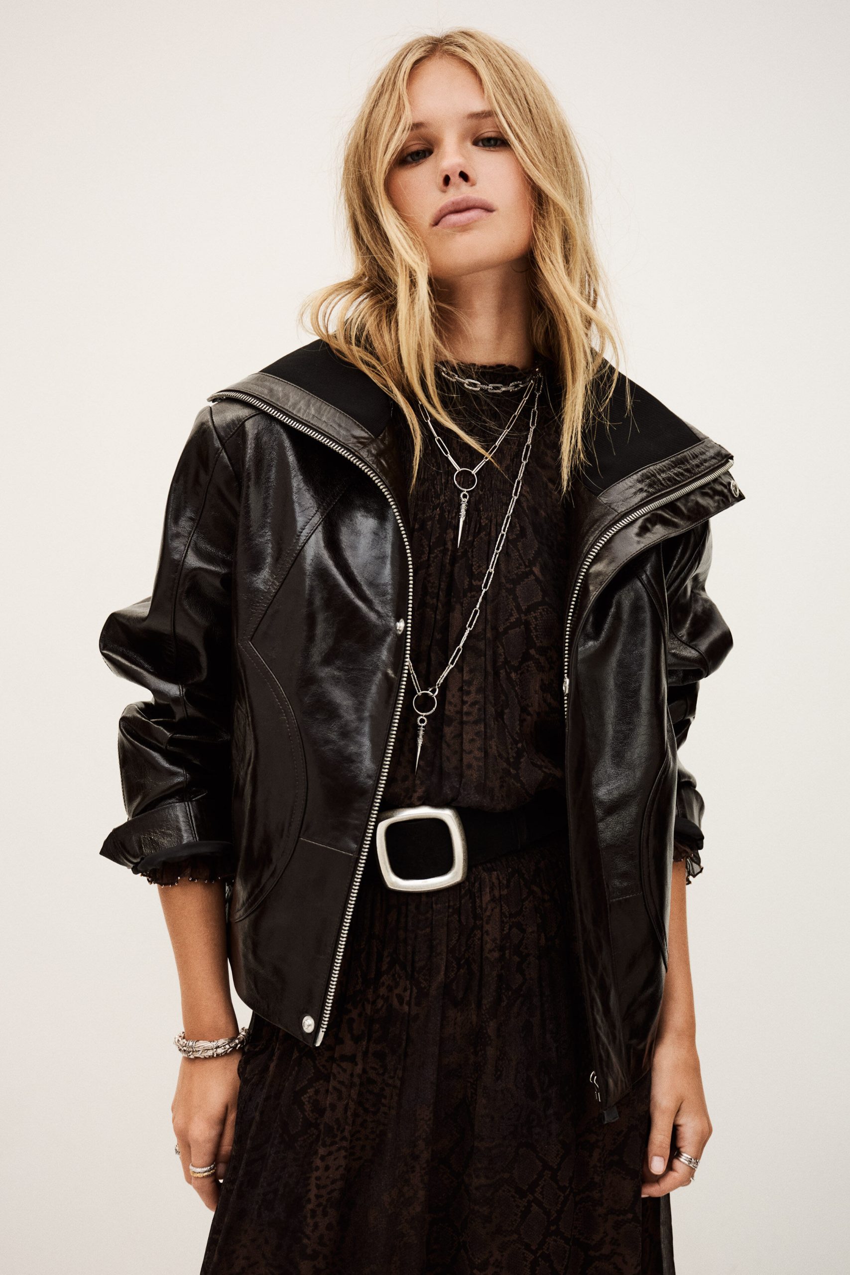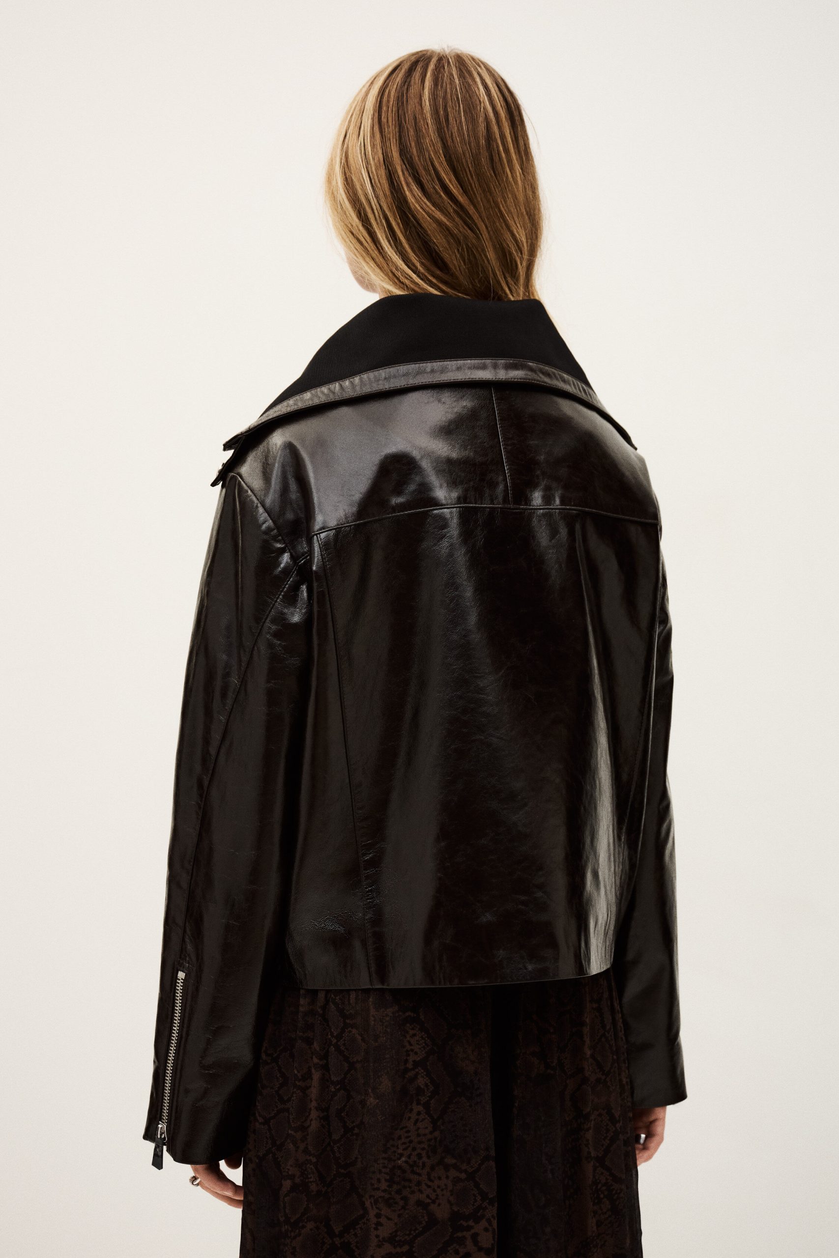 – Seams on the front- Black ribbed trim on the inside of the collar- Super high stand-up collar- Zippered cuffs- Shiny, slightly cracked leather- Zipper in the front middle, hidden by a leather tab- Boxy cutThis product was made from leather from a tannery certified according to the Leather Working Group protocol.