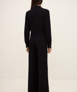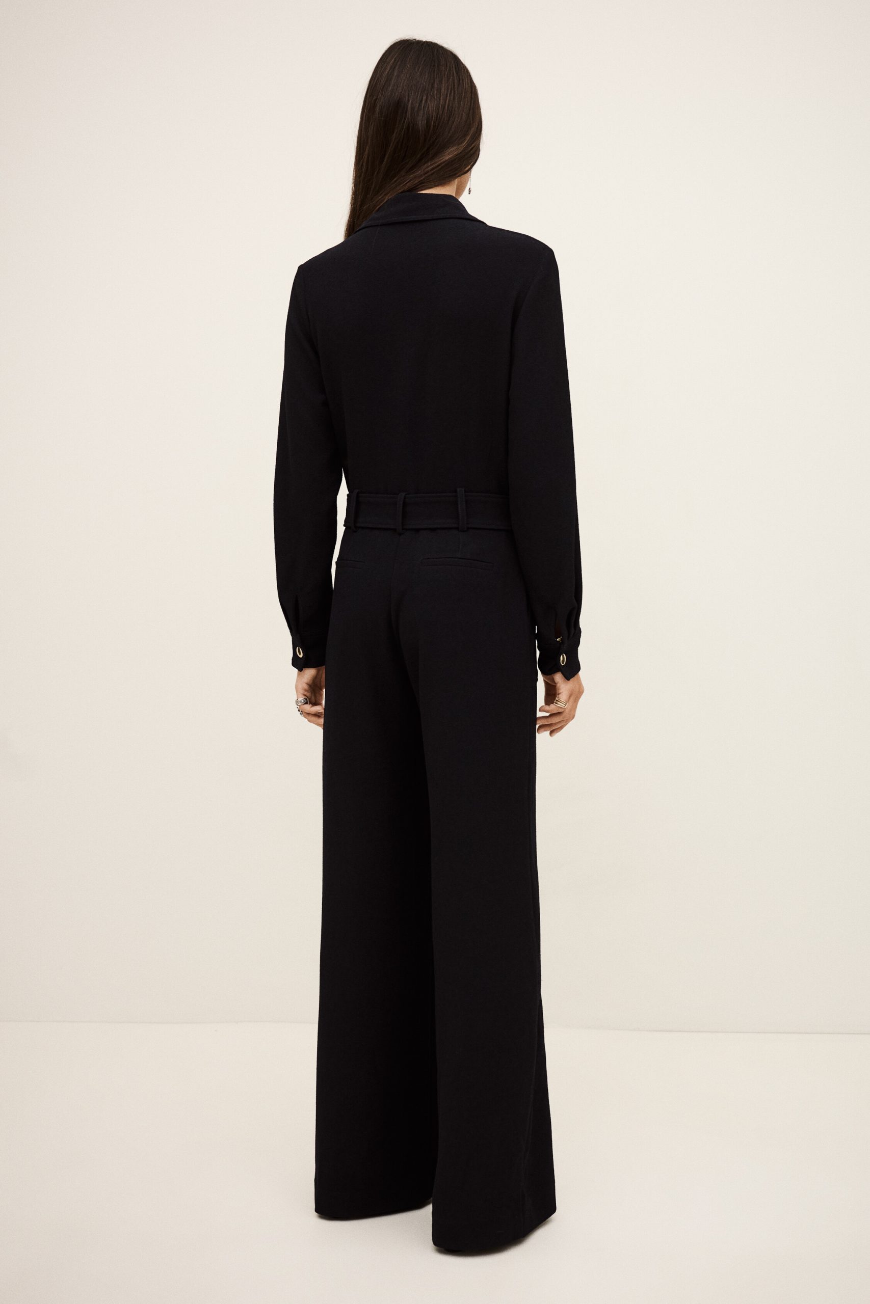 – Jumpsuit- Straight cut- Belted waist- Long sleeves- Zippered front- Shirt collar- Patch pockets with flaps on the chest- Piped pockets on the back of the pants- Raglan pockets on the side- Belt loops