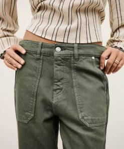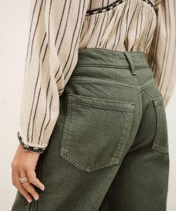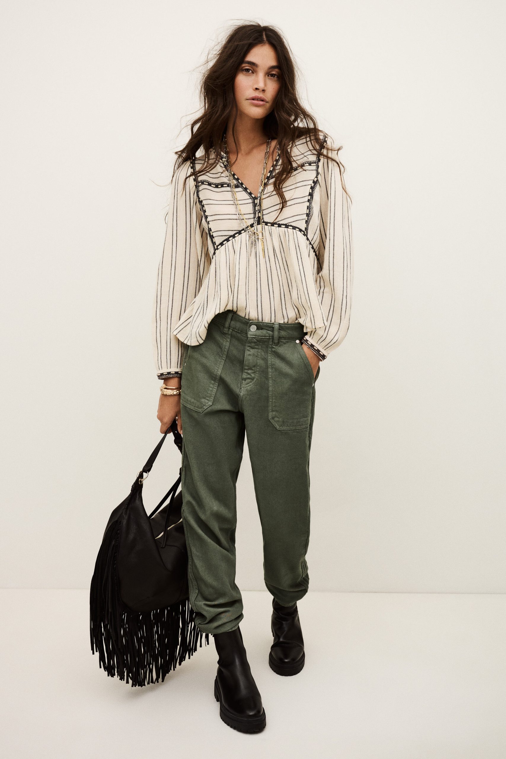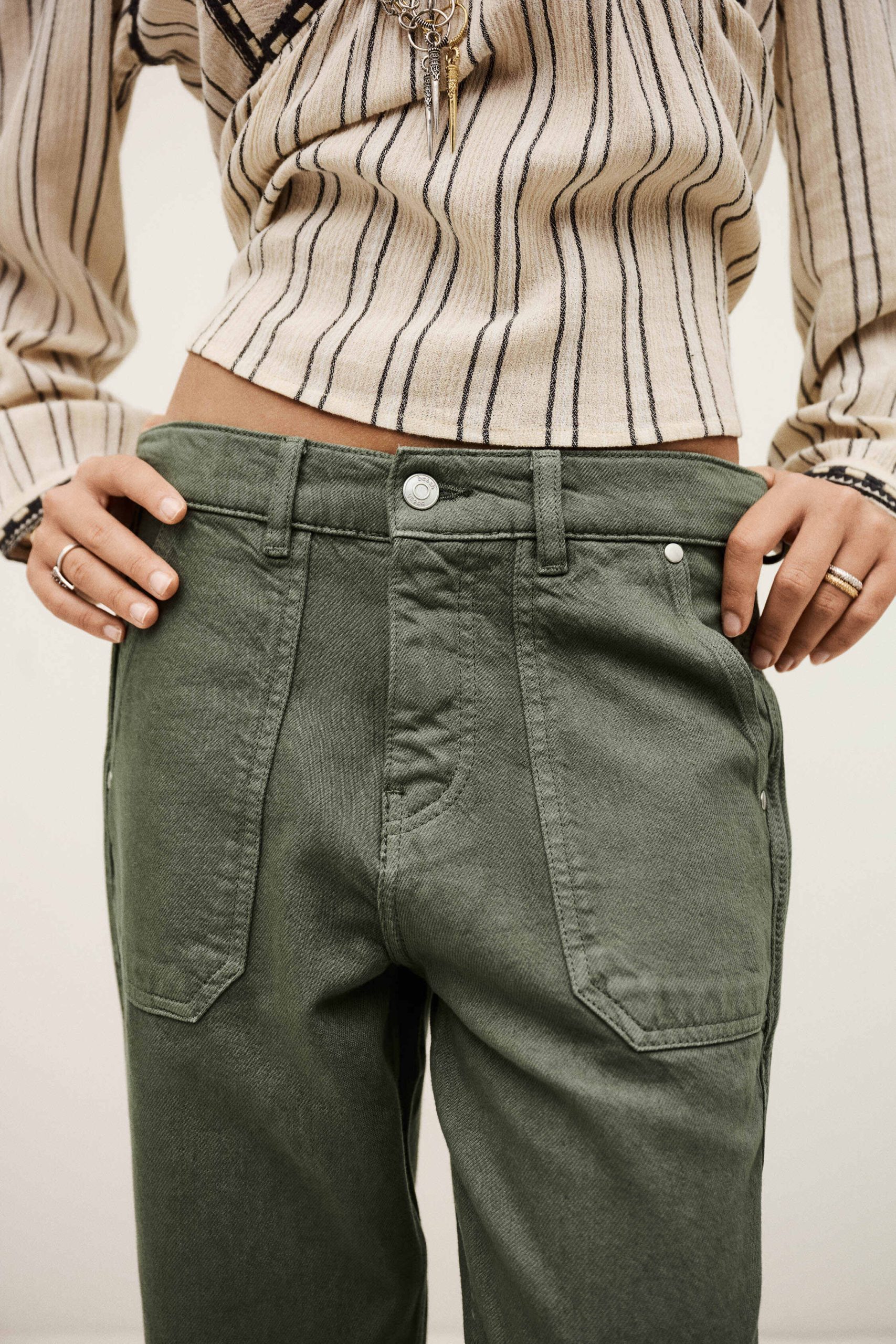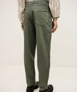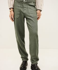 – Loose-fitting- Jogging style- Zipper and button- Belt loops- Patch pockets in front