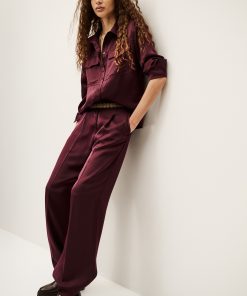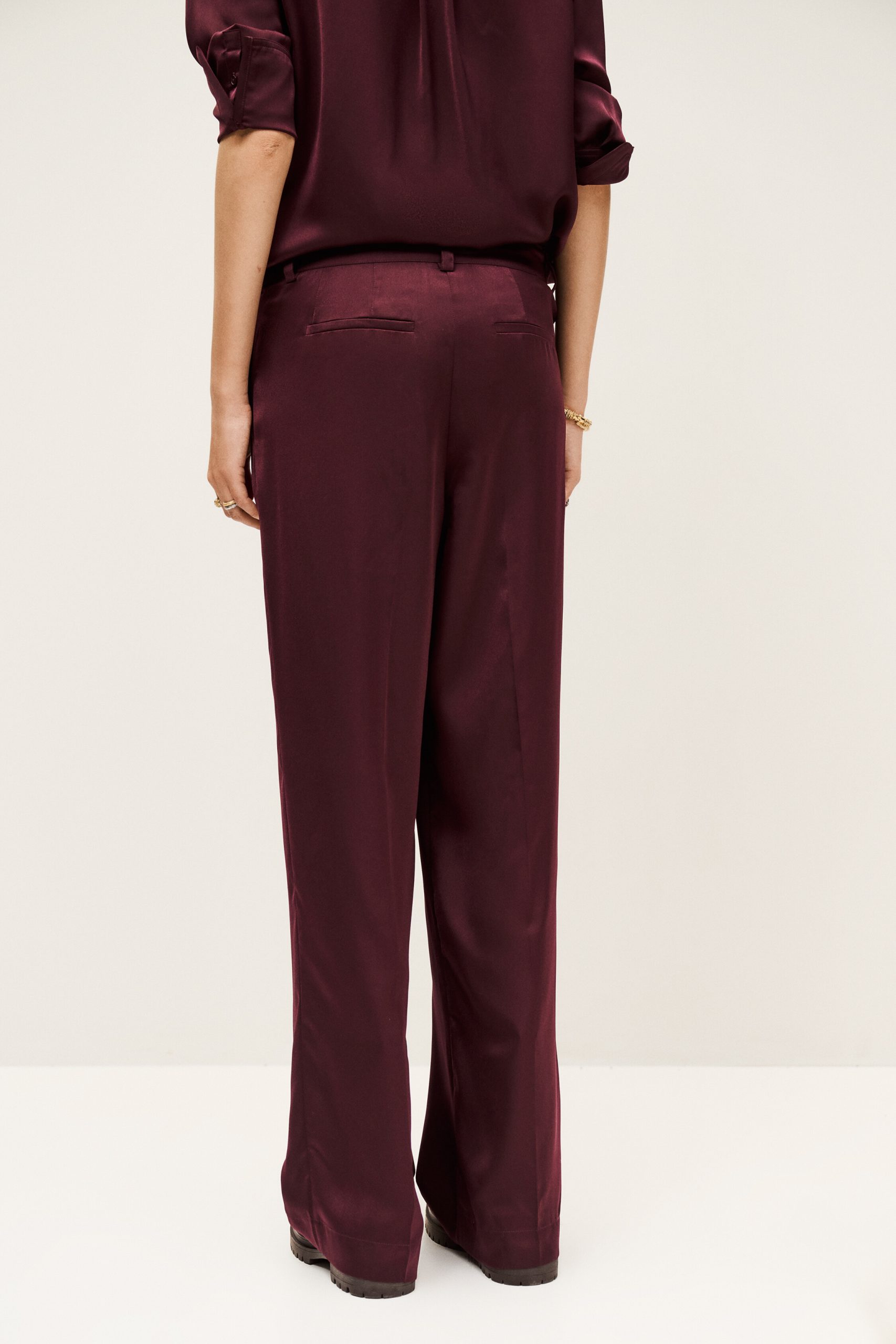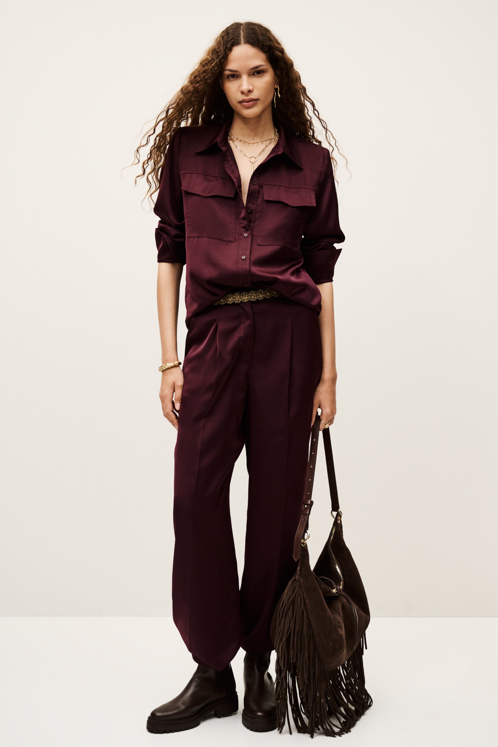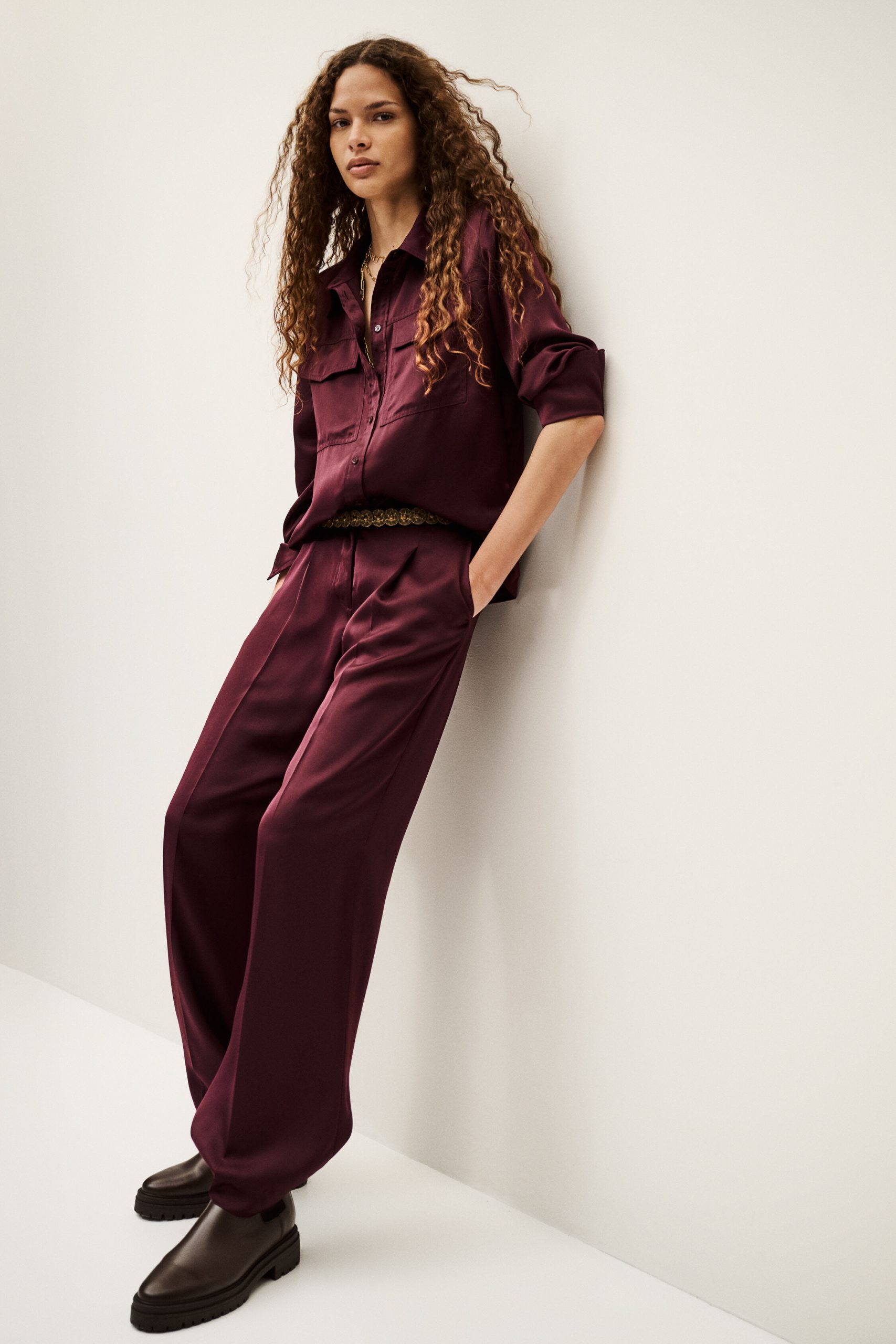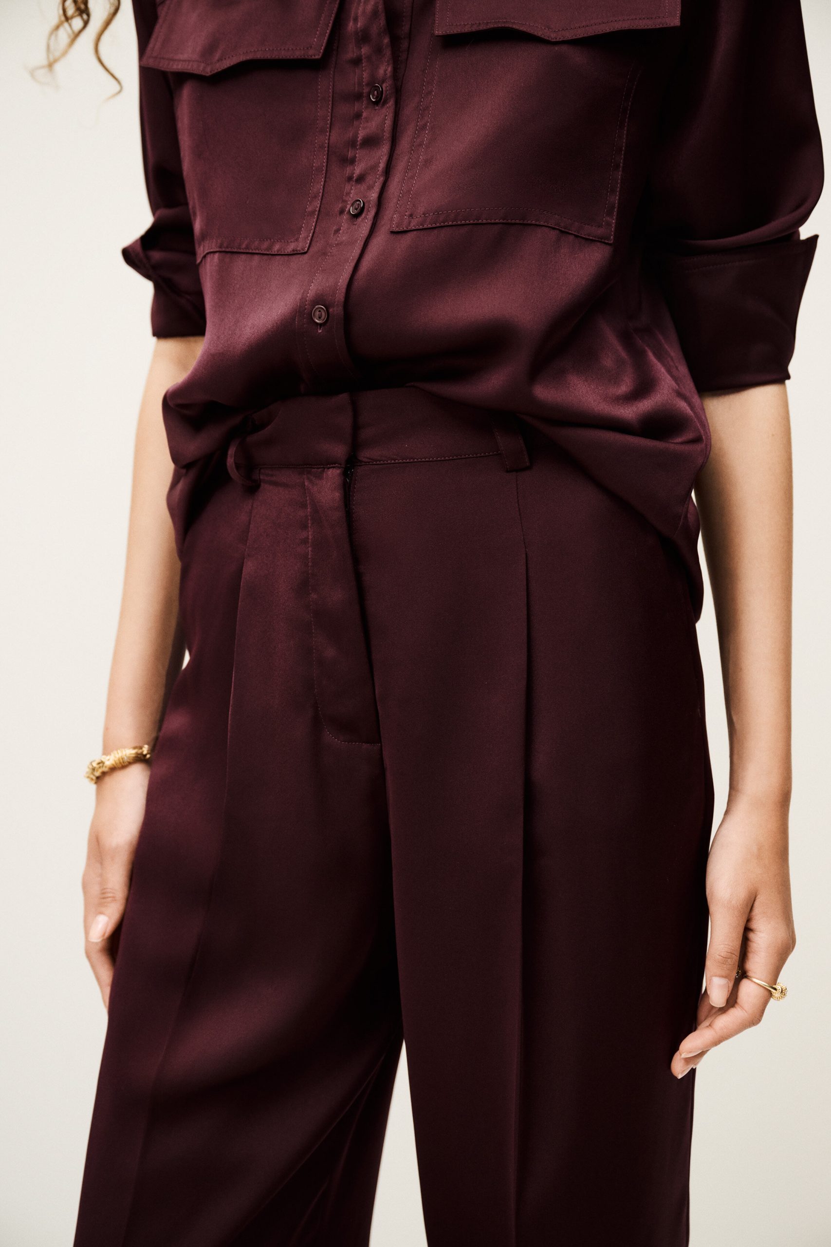 – Loose-fitting- Medium-rise waist- Pleated front- Loops for wide belt- Piped pockets on the back- Hook and zipper closureThis model contains recycled synthetic fibers.