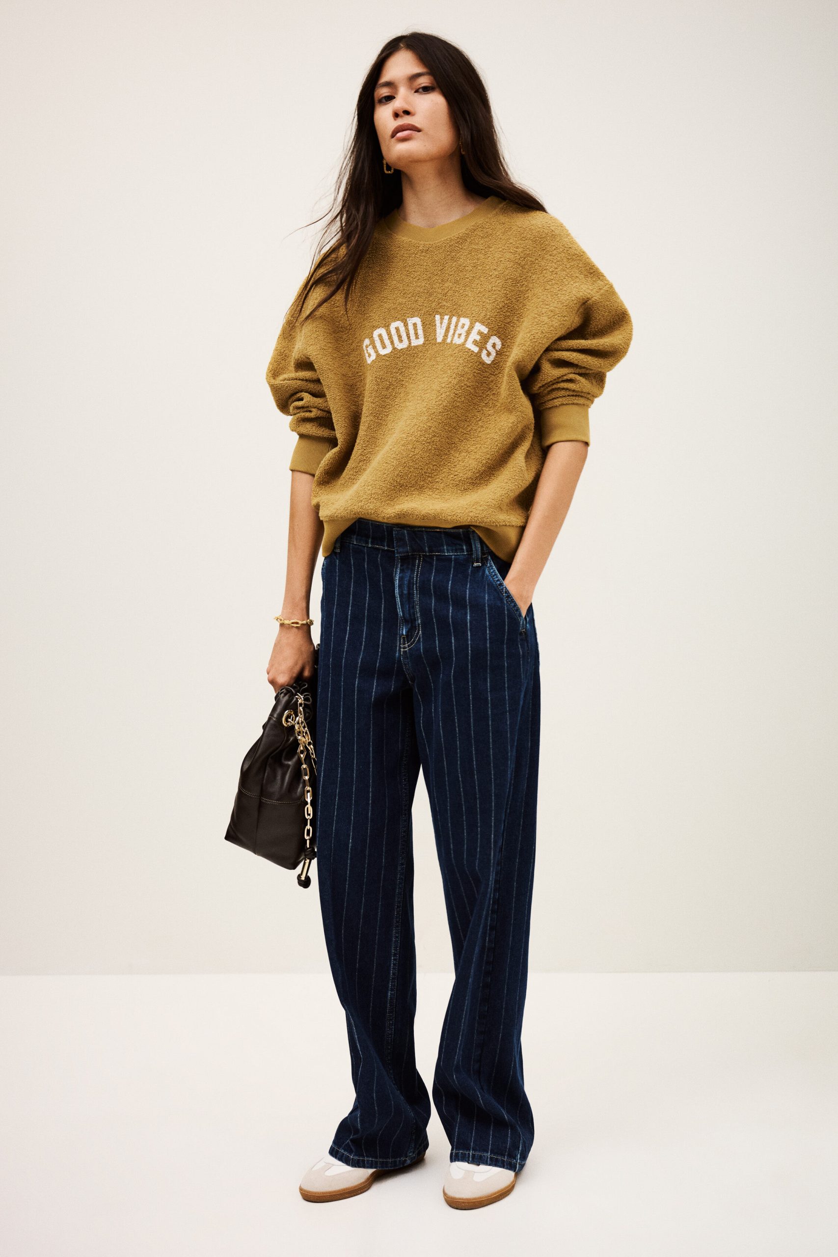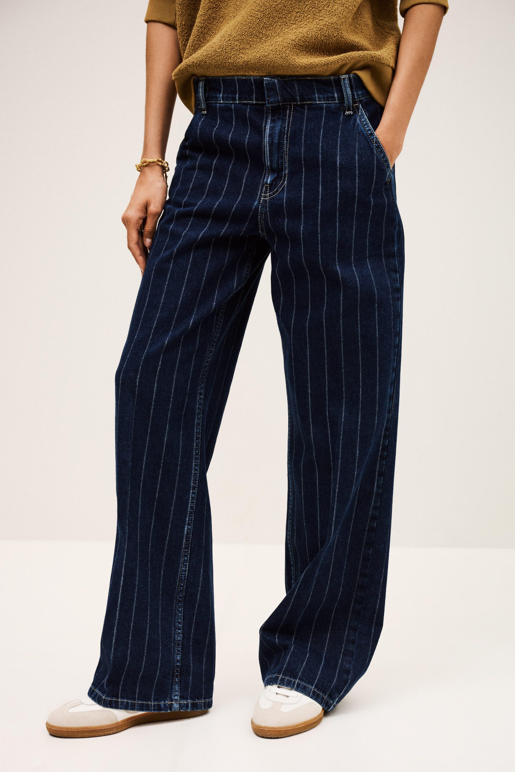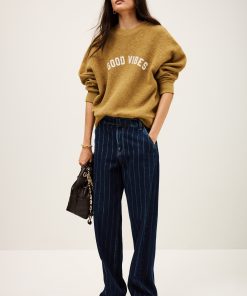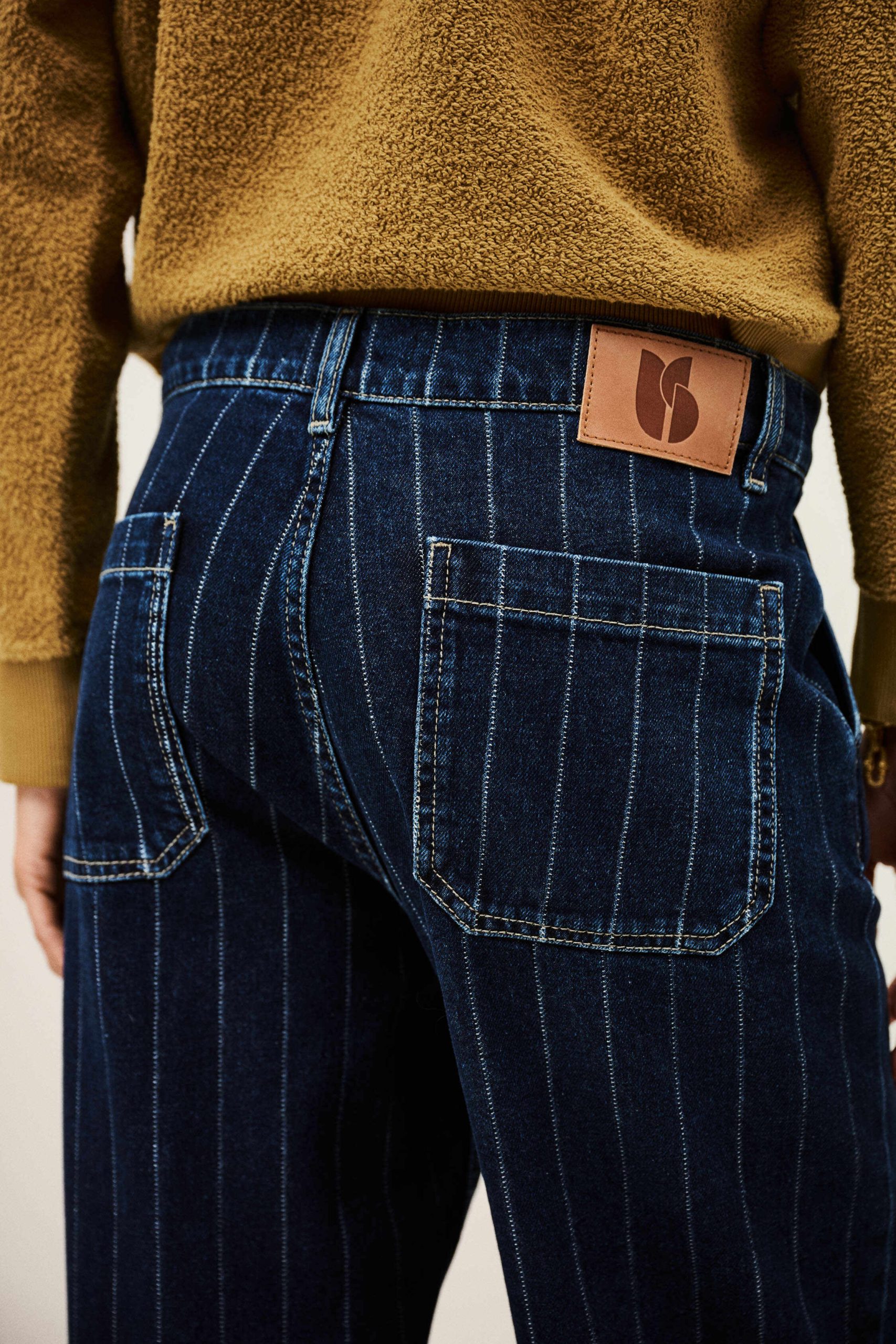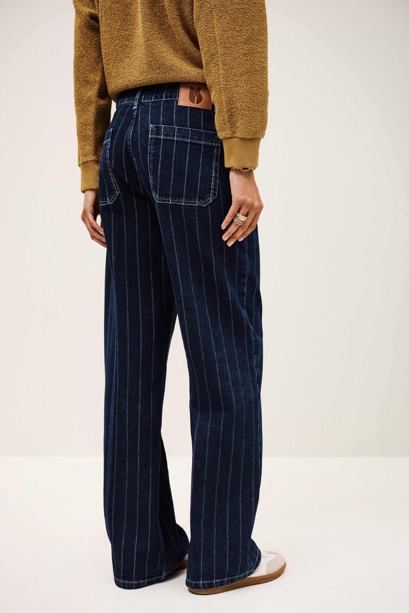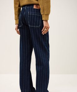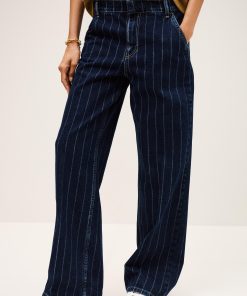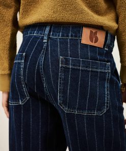 – Gender-bending jeans- Straight and loose-fitting- Medium-rise waist- Whitewashed pleats- Darts above the rear pockets- Slant pockets- Hidden buttons- Faded blue denimThe cotton fibers in this model come from organic farming.