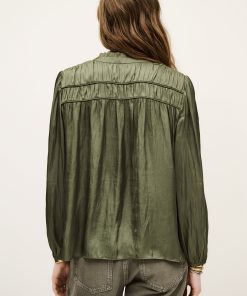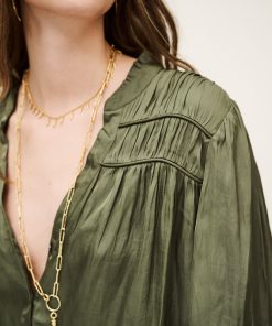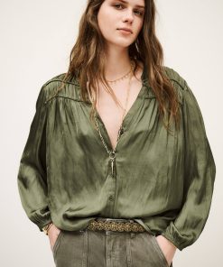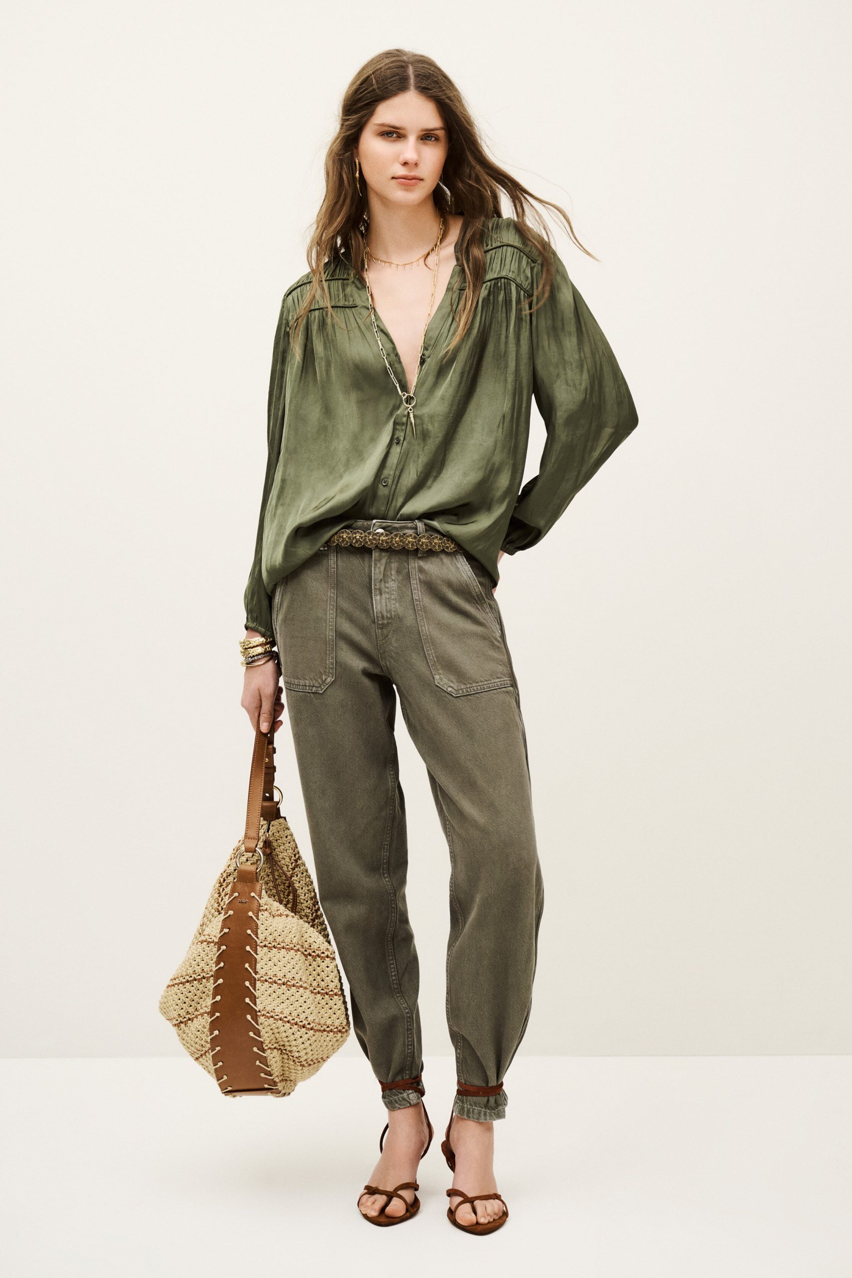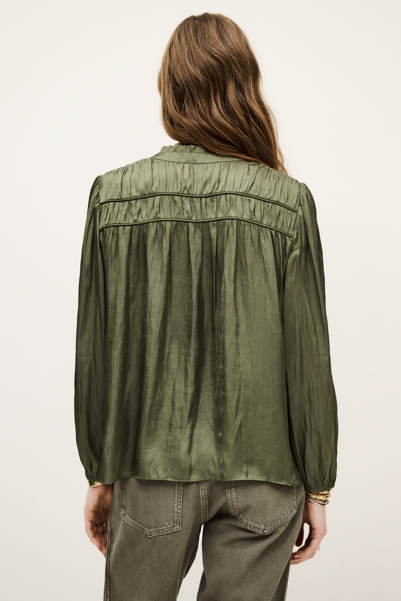 – Loose-fitting- Buttoned- V-neckline- Tapered cuffs- Frilly collar- Inlaid biasThis model contains recycled synthetic fibers.