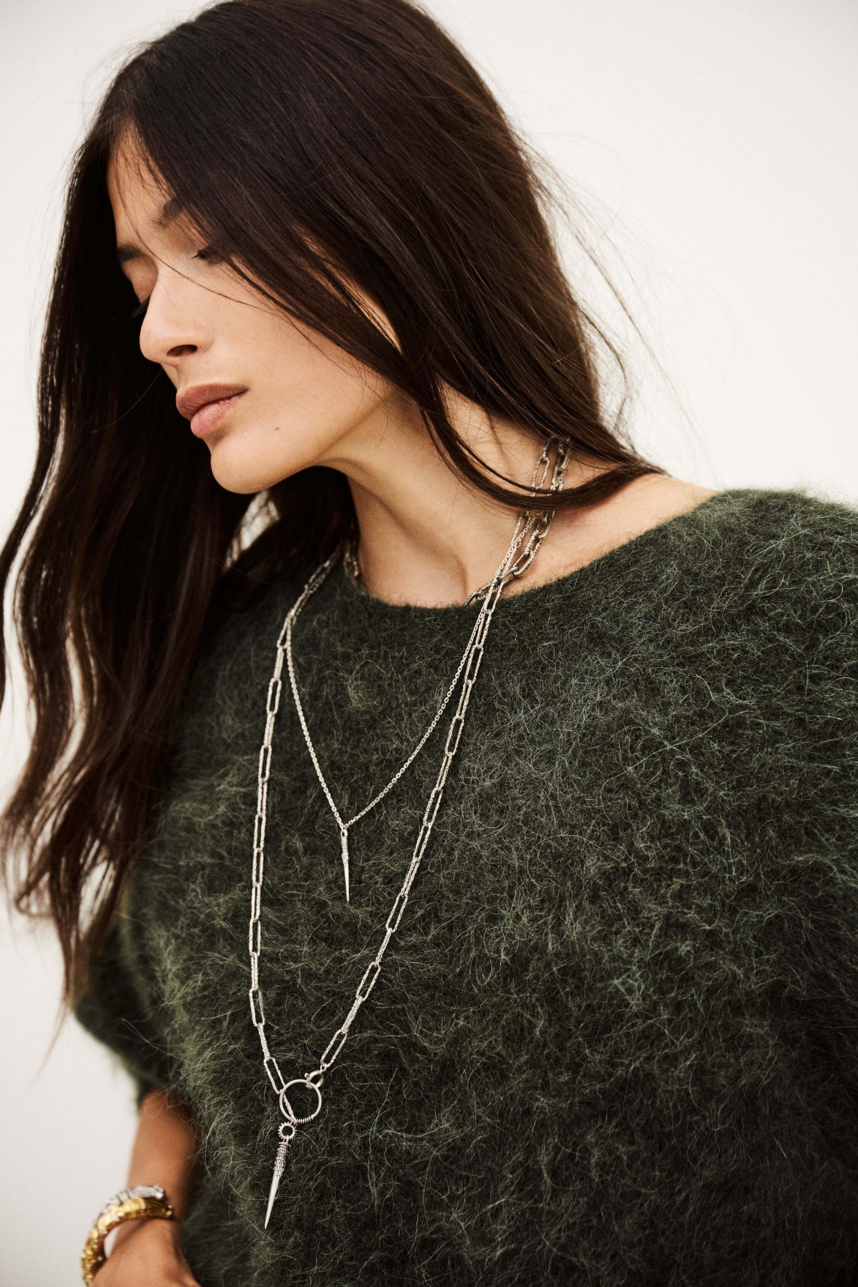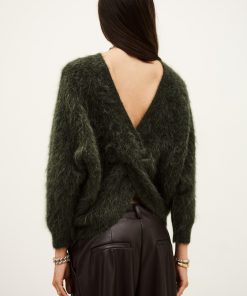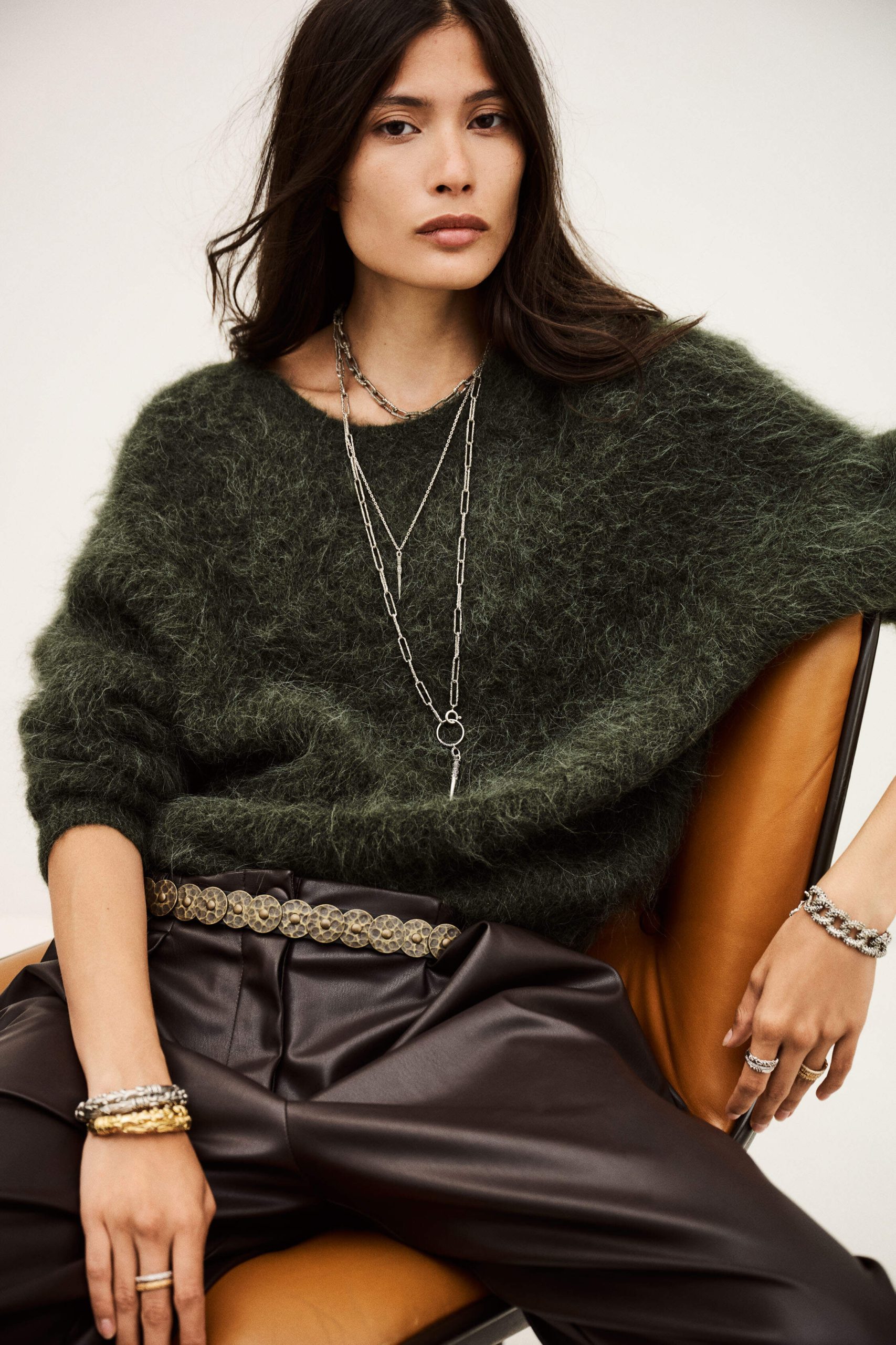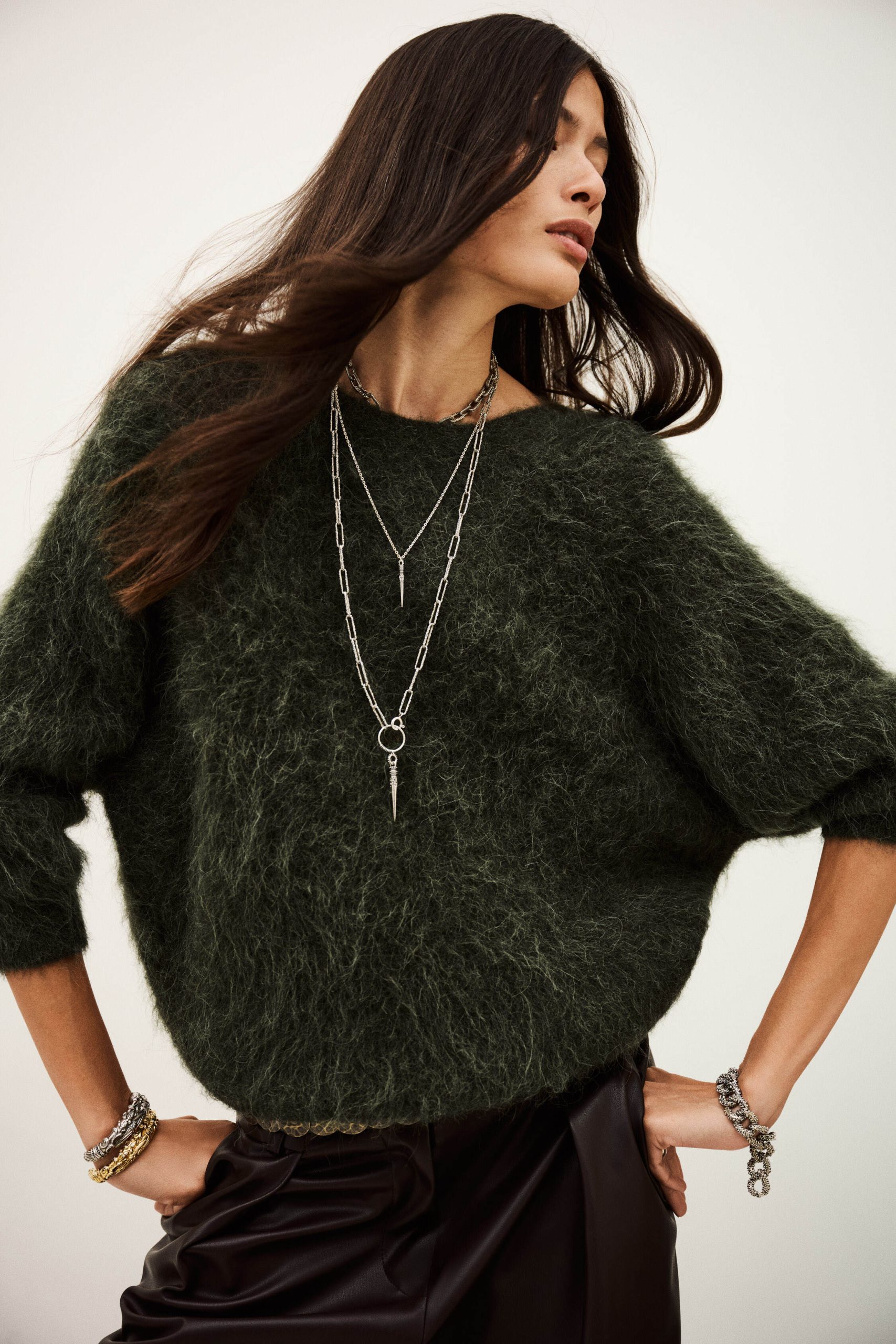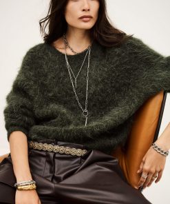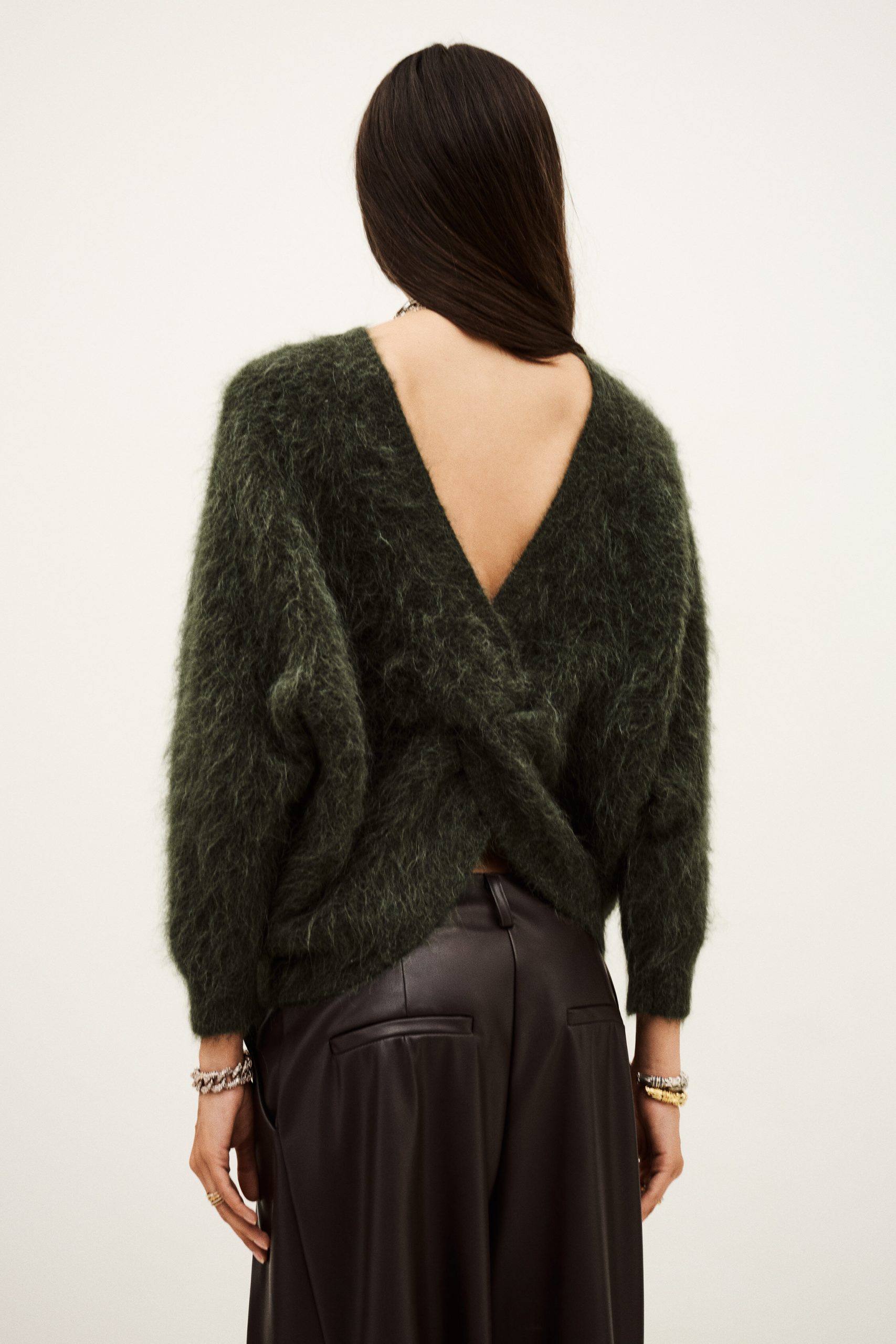 – Long-sleeve sweater- Loose-fitting- Round neckline- Straight cut- Low-cut V-neckline in back- Super glamorous draped style- Woven fabric on the back for an extra touch of flairThis item is made with alpaca wool derived from a certified production chain guaranteeing the welfare of animals and the sustainable management of pastures.The alpaca wool in this model comes from a certified supply chain that ensures animal welfare and sustainable pasture management.