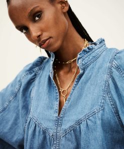 – Blouse style- Loose-fitting- Long puff sleeves- V-neckline- Frilly details- Gathers- Denim materialThe cotton fibers in this model come from organic farming.