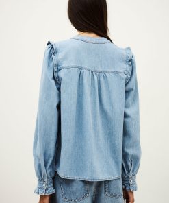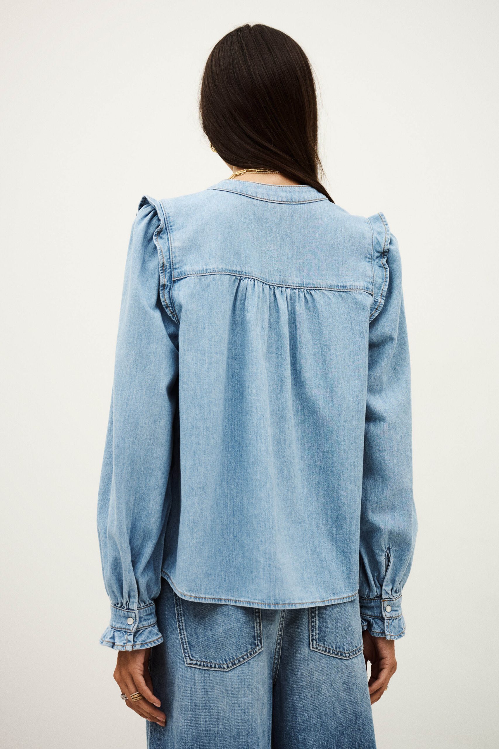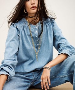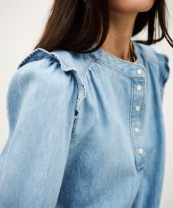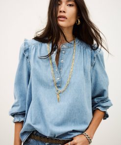 – Shirt style- Frilly stand-up collar- Long sleeves- Button tab in front- Mother-of-pearl buttons- Frilly cuffs- Gathered back- Denim materialThe cotton fibers in this model come from organic farming.