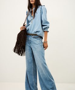 – Shirt style- Frilly stand-up collar- Long sleeves- Button tab in front- Mother-of-pearl buttons- Frilly cuffs- Gathered back- Denim materialThe cotton fibers in this model come from organic farming.