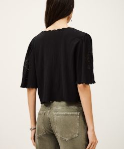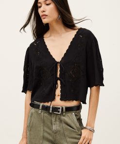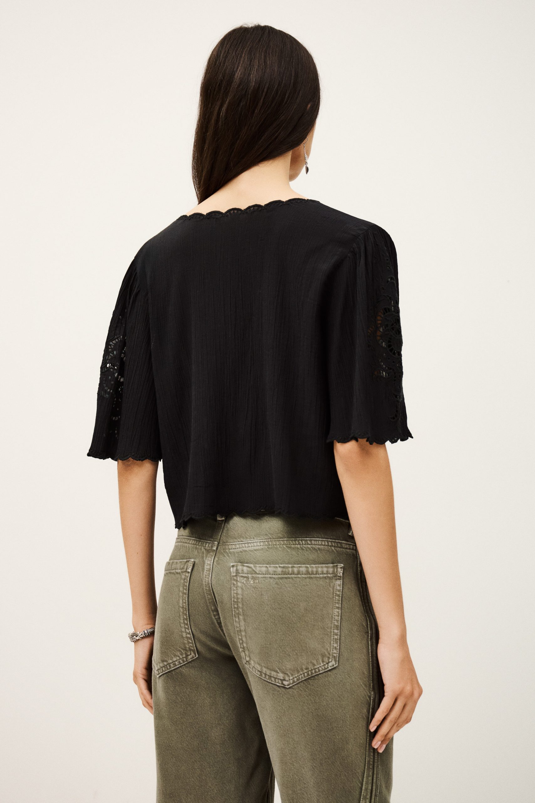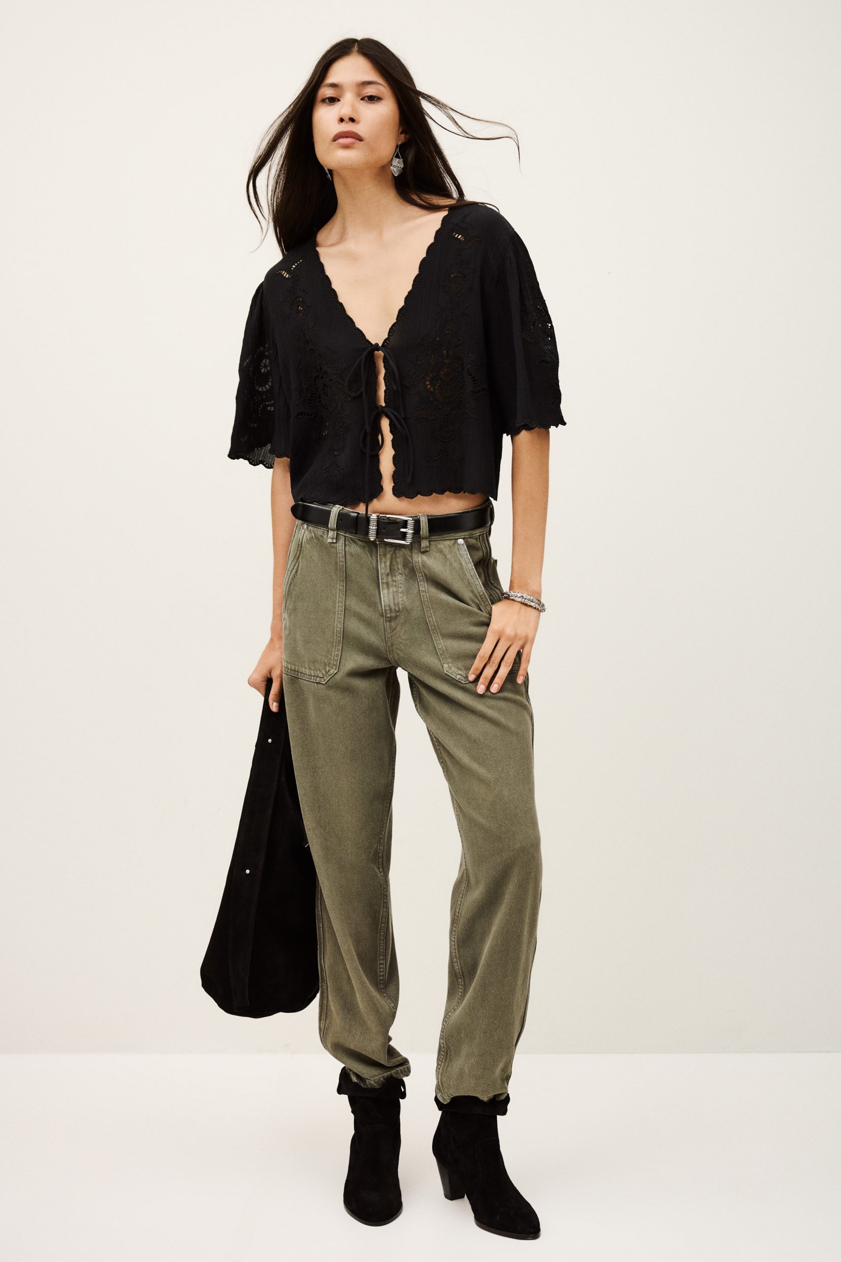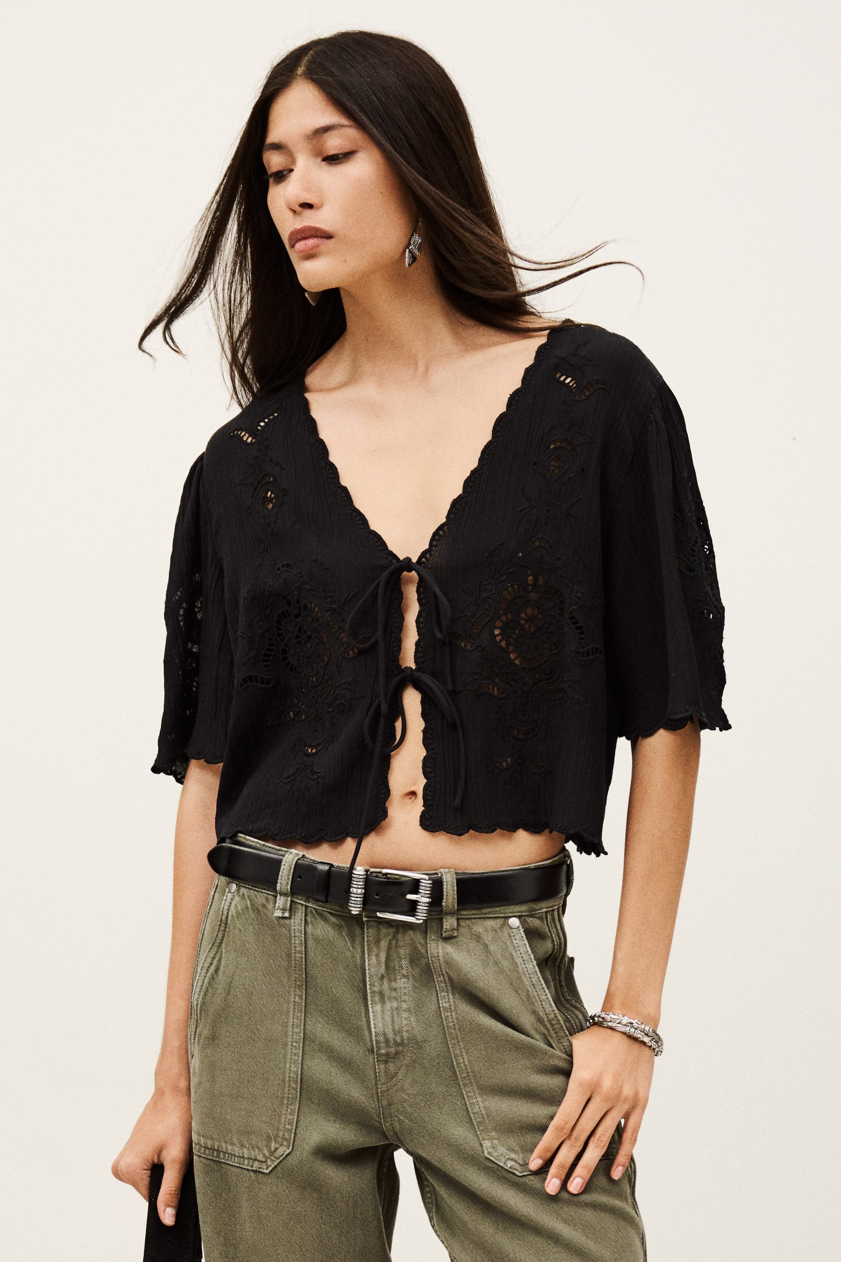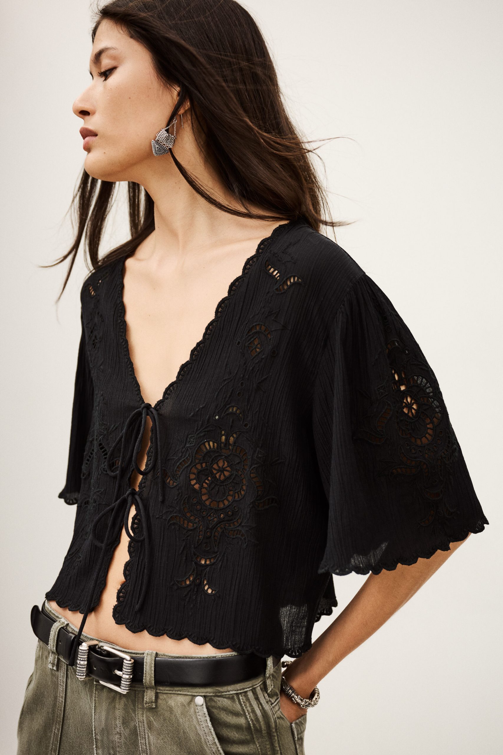 – Straight cut- Loose-fitting- Transparent look- Openwork details- Short, loose-fitting sleeves- Braid detail- V-neckline- Lace-up style- The viscose in this model is made from wood pulp from sustainably managed forests.