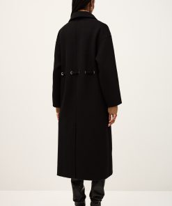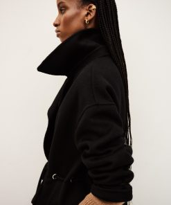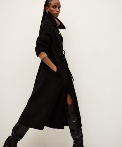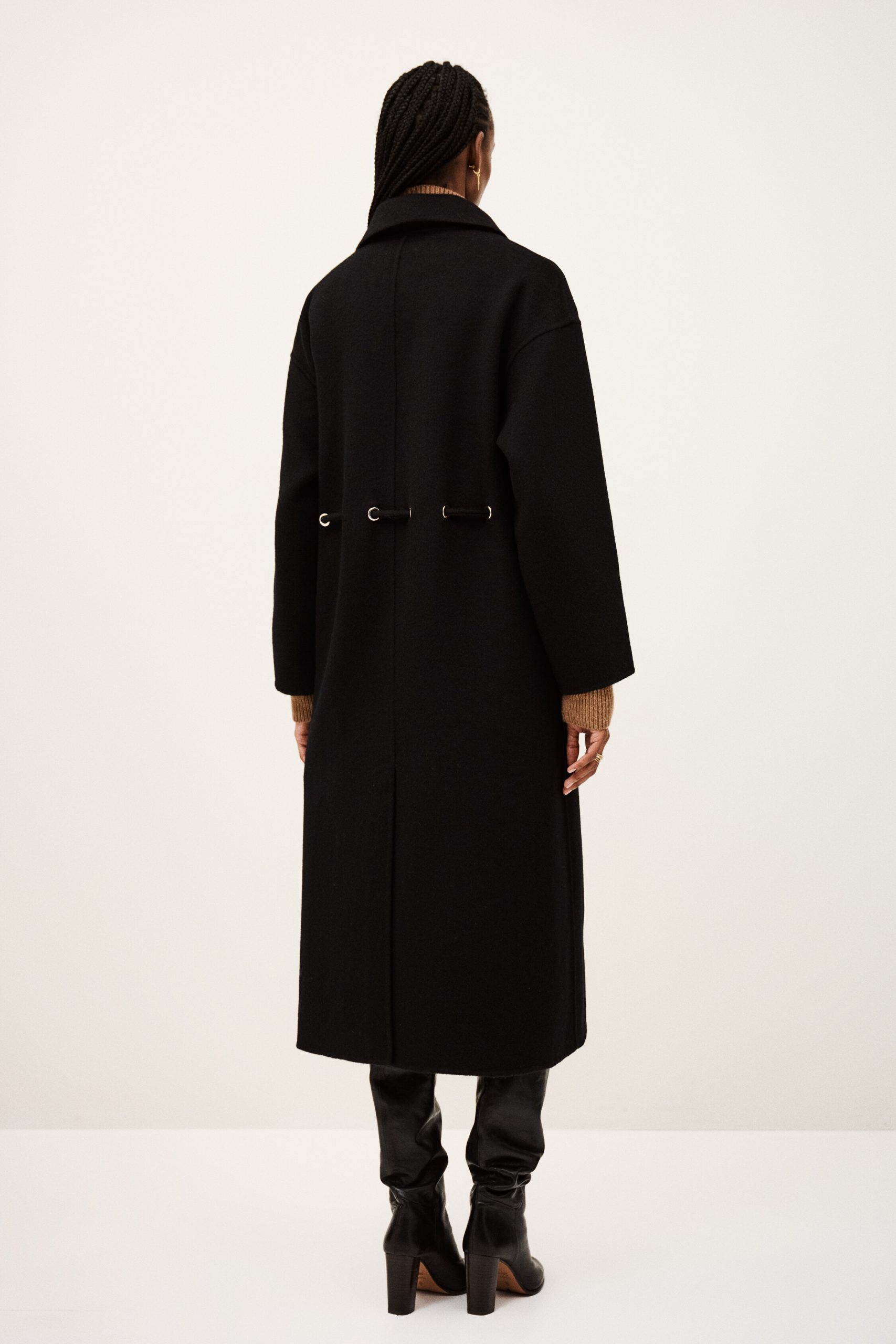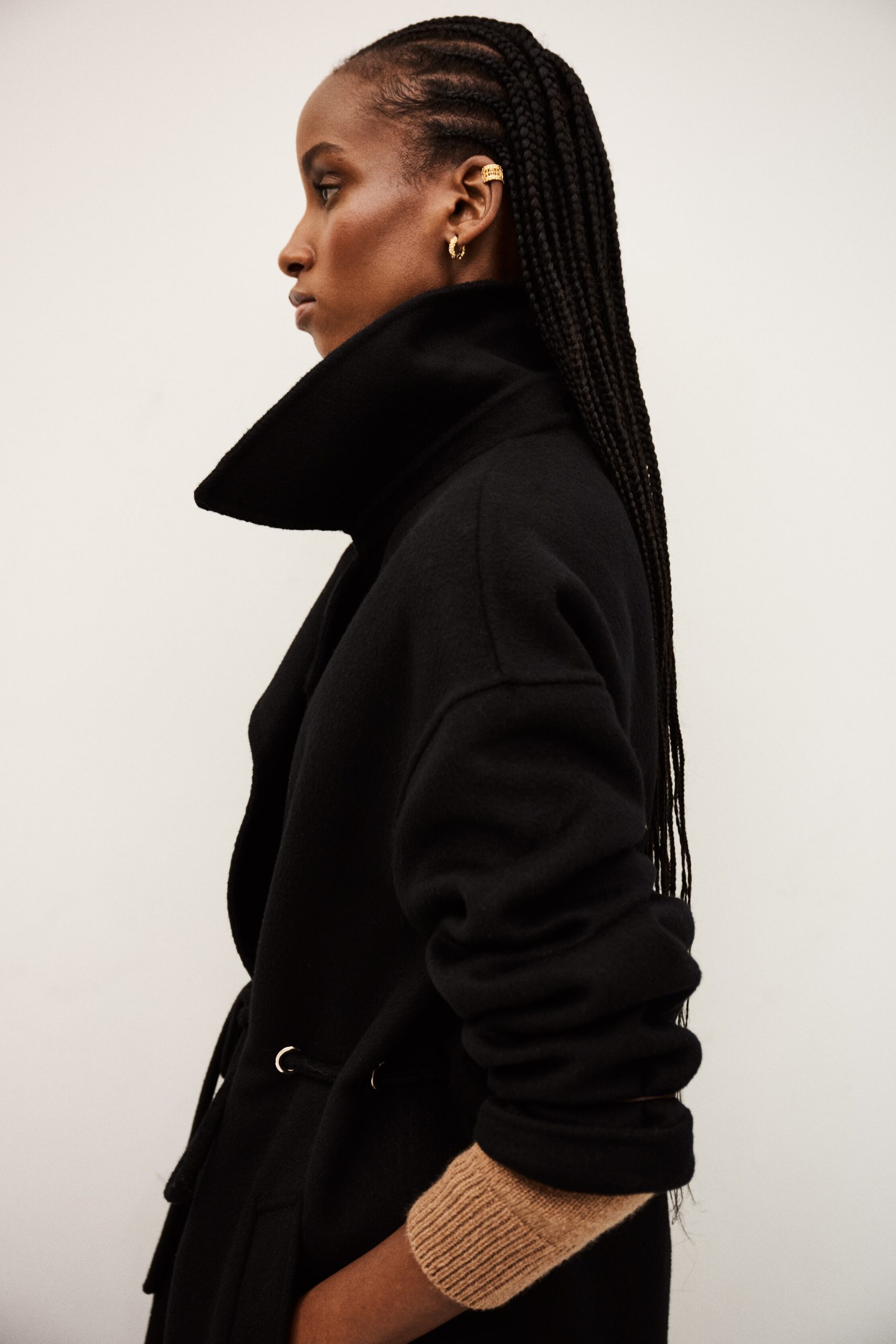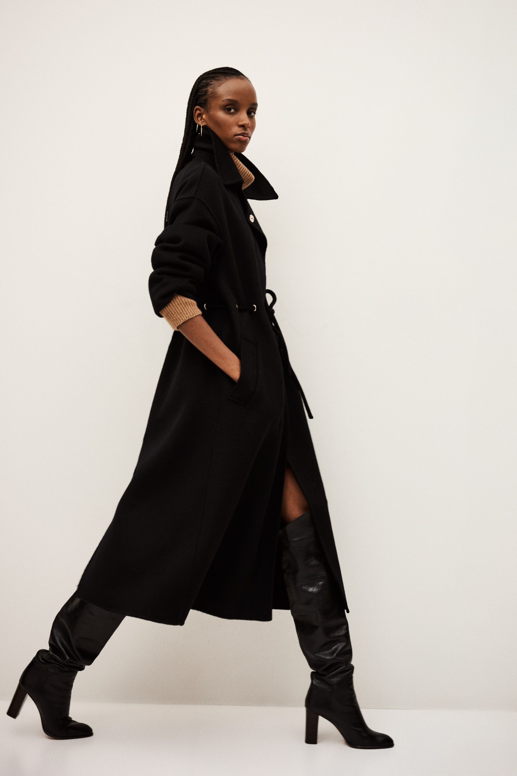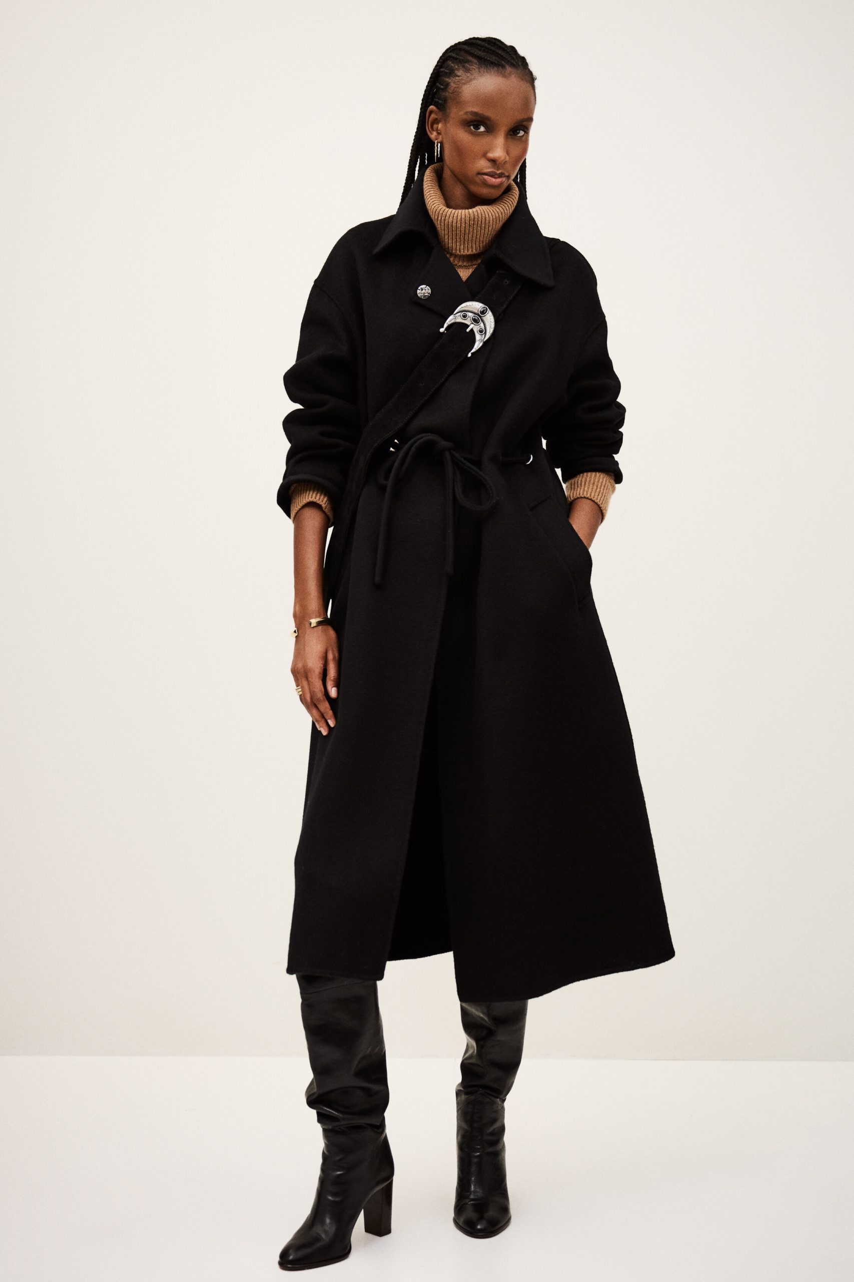The ba&sh KATE coat is a key piece this season. This long coat has minimalist style with a shirt collar, slightly dropped shoulders, piped pockets and it hits below the knee. It is cut in a double-sided wool-rich fabric. The fashion plus is the tie belt in the same fabric and the golden grommets on the waist. Chic and streamlined with a pretty feminine feature. -This style contains TENCEL Lyocell, a fabric made from wood pulp sourced from sustainably-managed forests and a closed loop process. LENZING and ECOVERO are registered Lenzing brands. – Long coat- Shirt collar- No buttons- Tie belt- Back slit- 80% wool, 20% polyamide